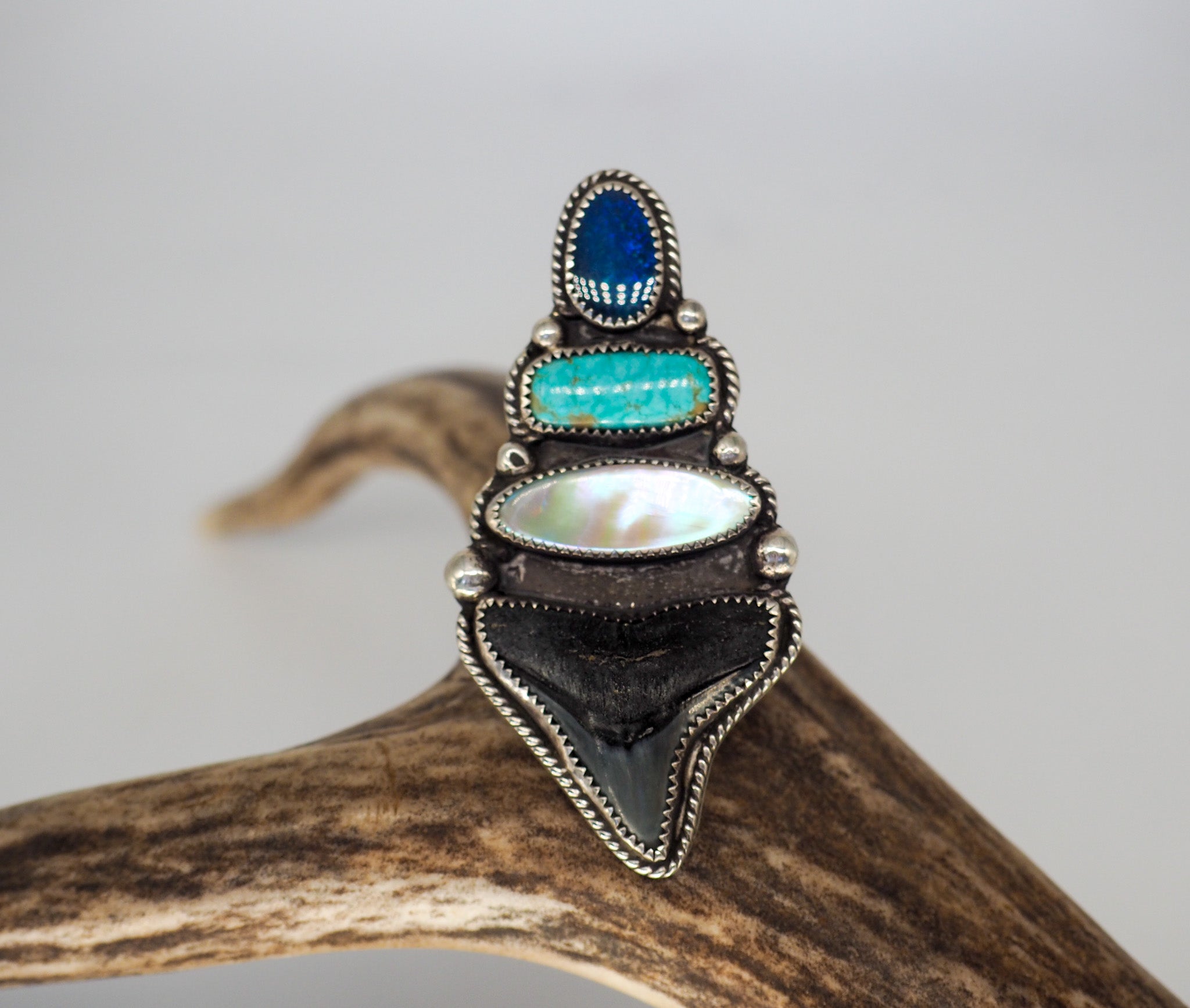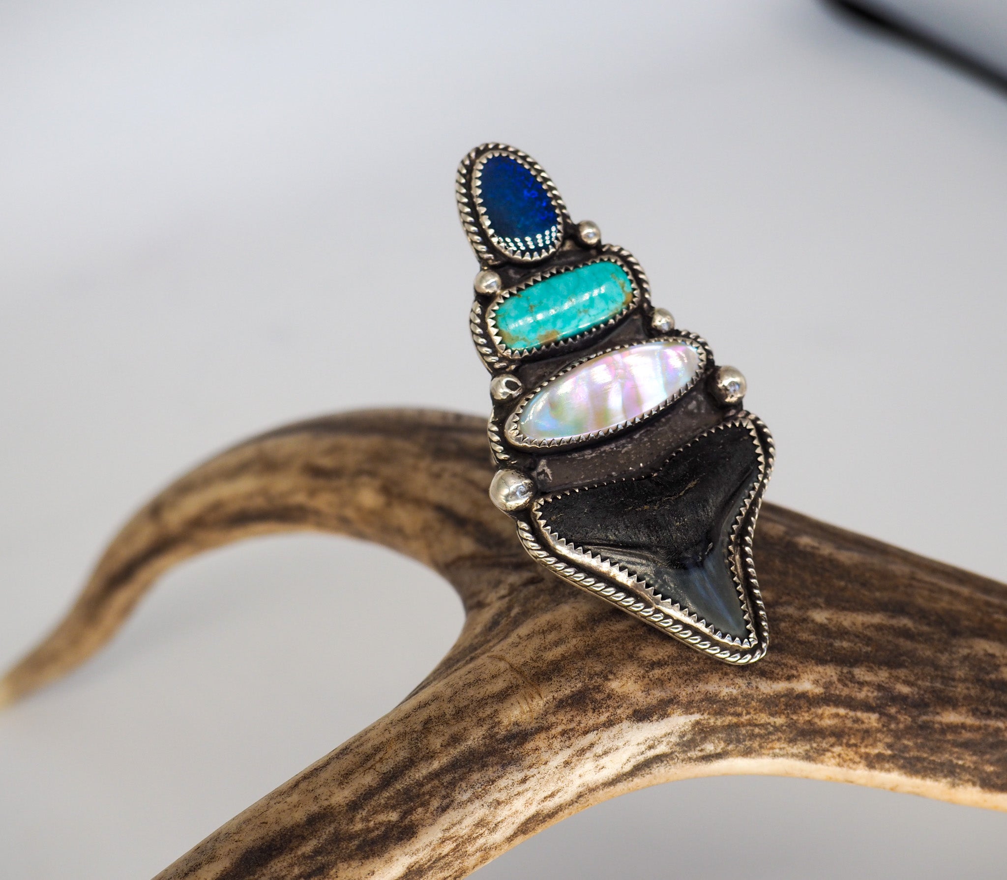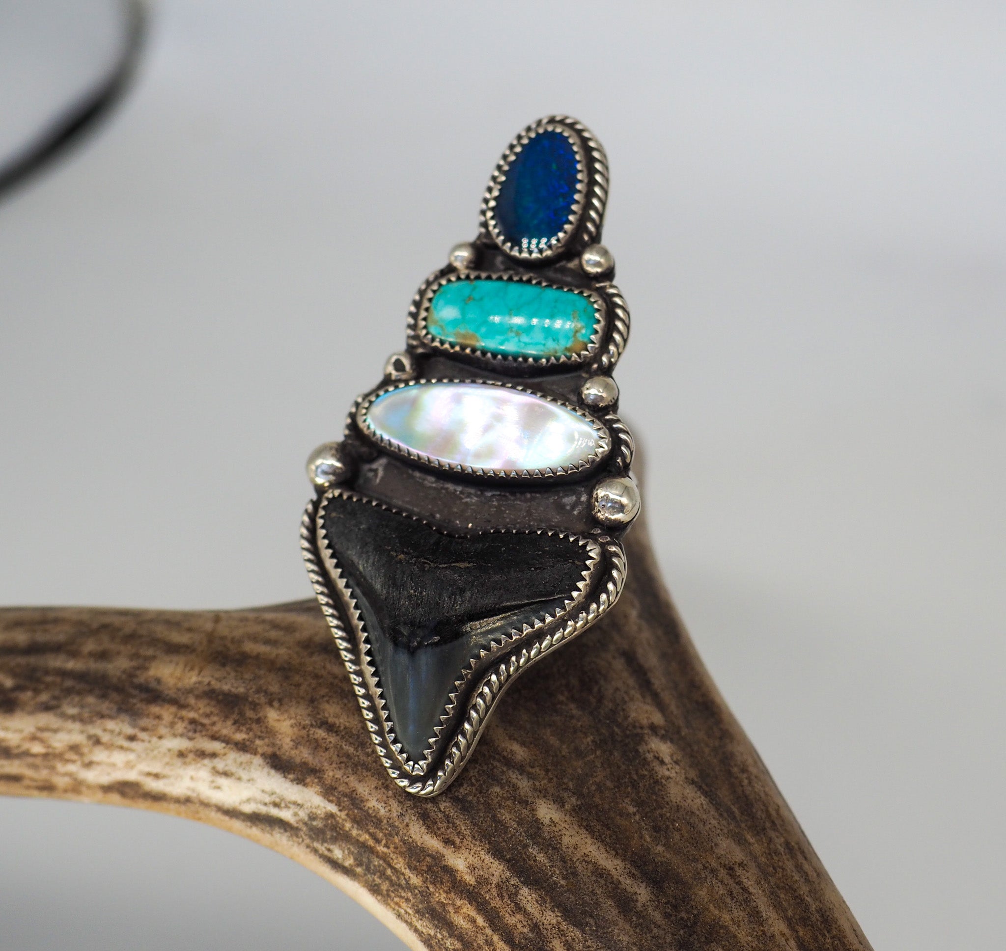 Made with a Opal doublet, Turquoise, Mother of Peal, Shark Tooth & Sterling Silver