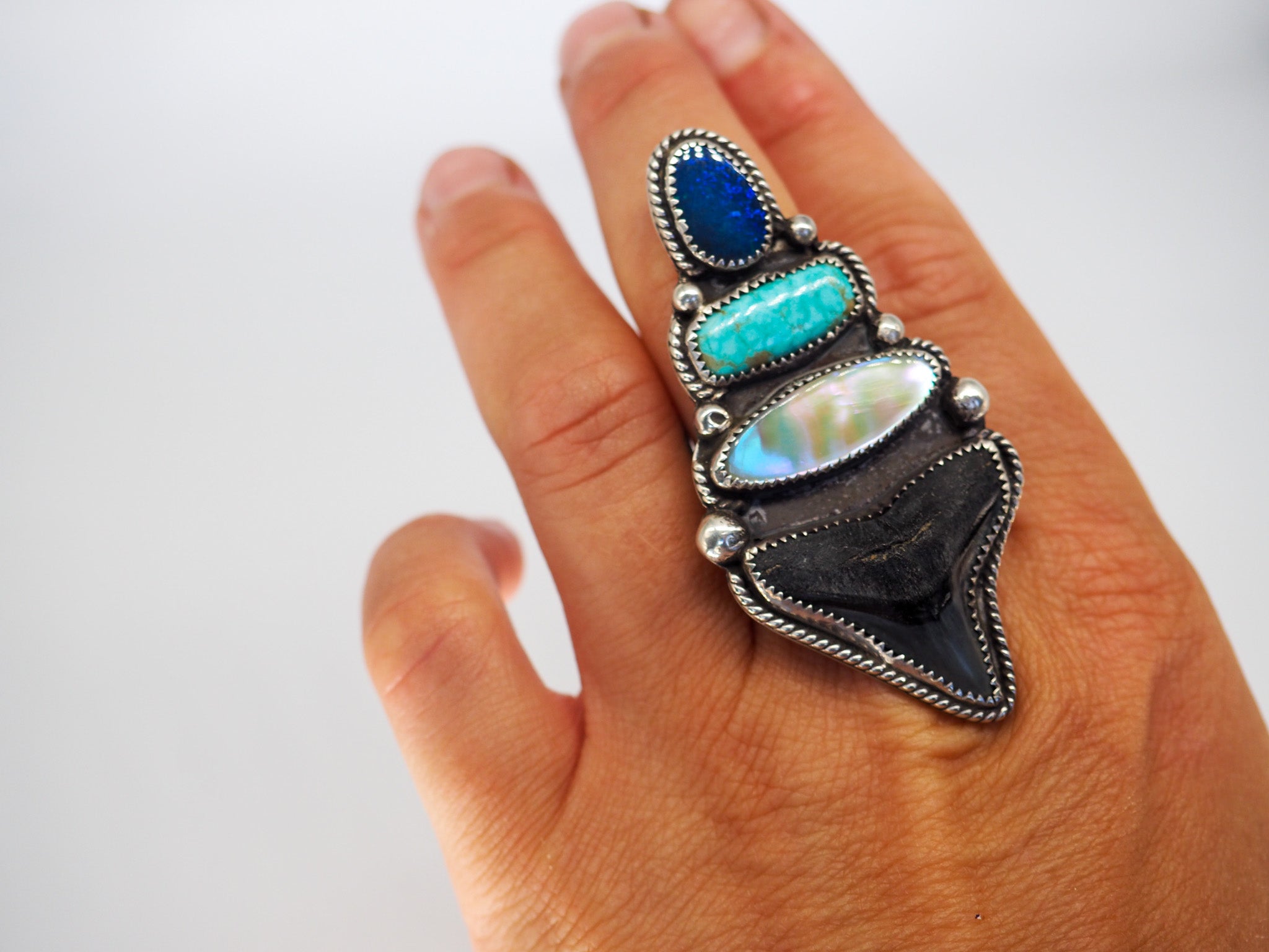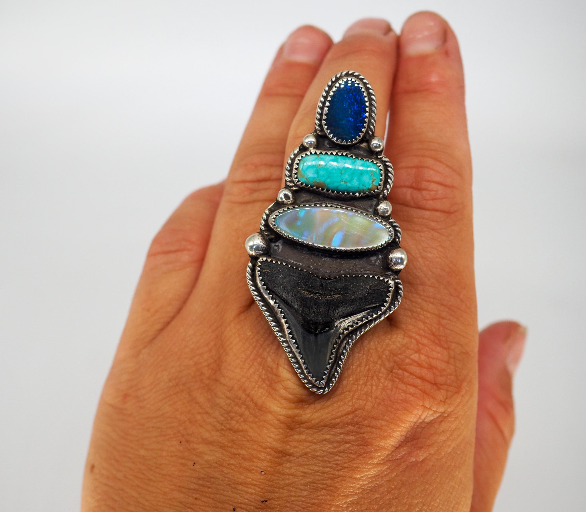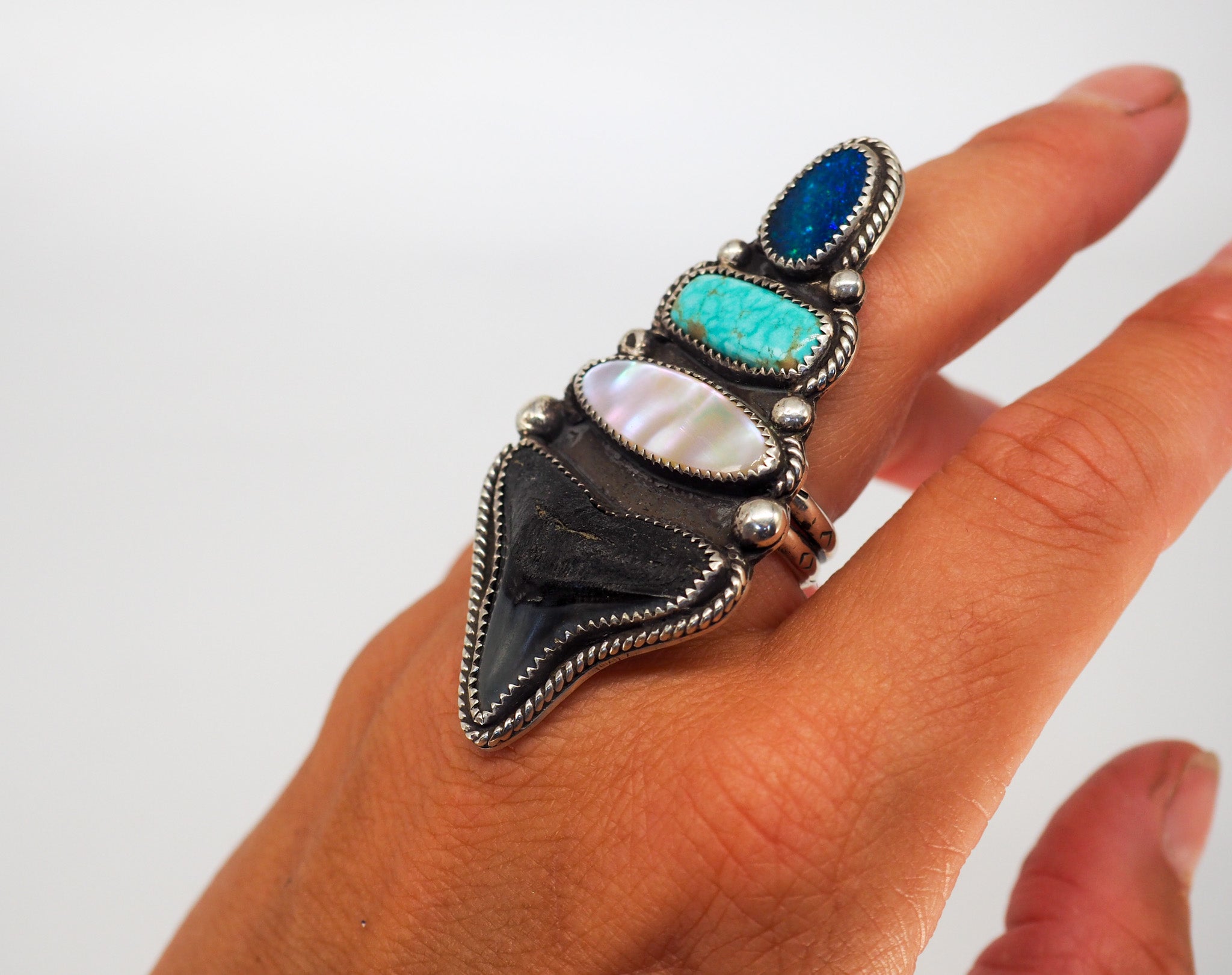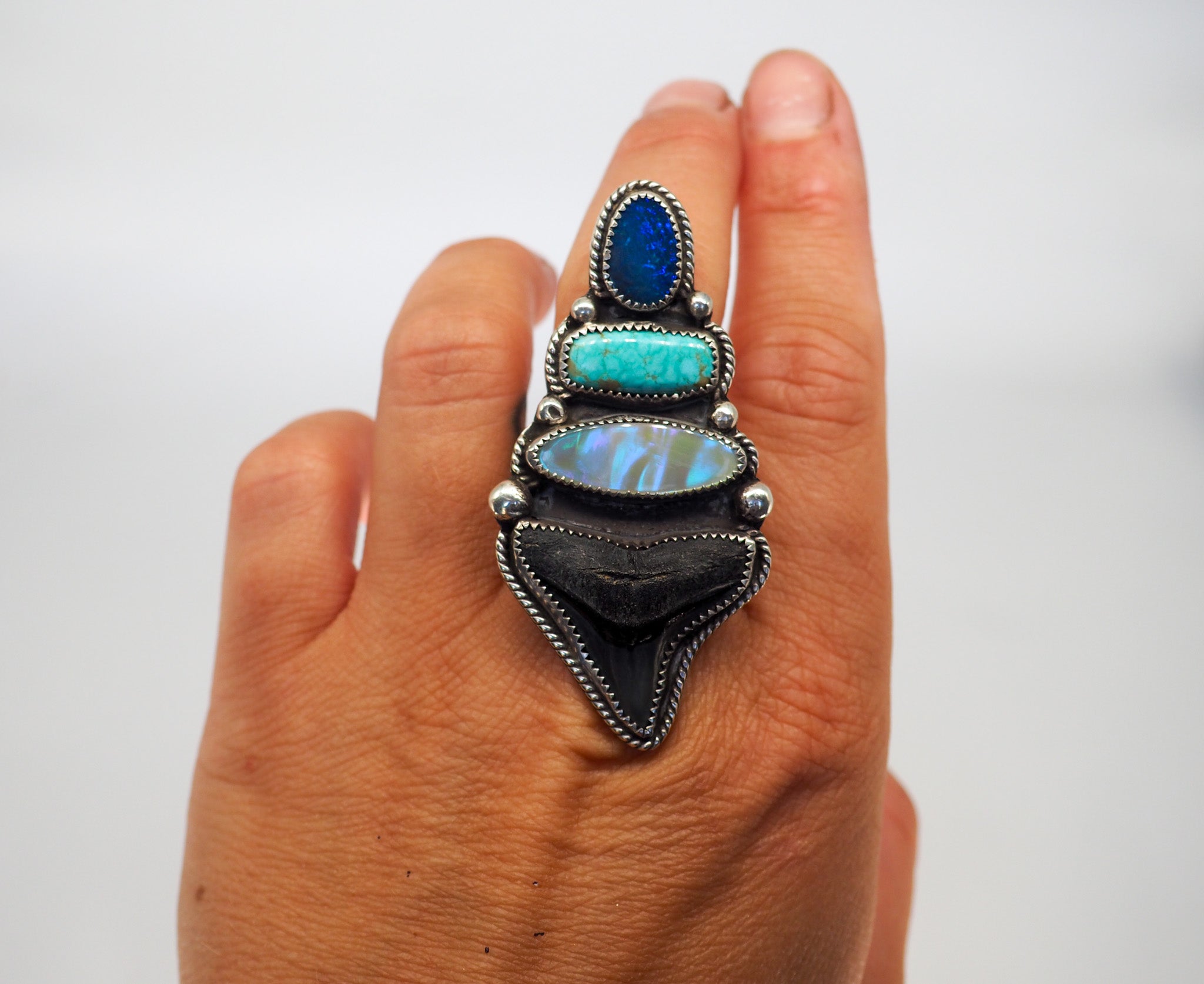 Made with a Opal doublet, Turquoise, Mother of Peal, Shark Tooth & Sterling Silver
