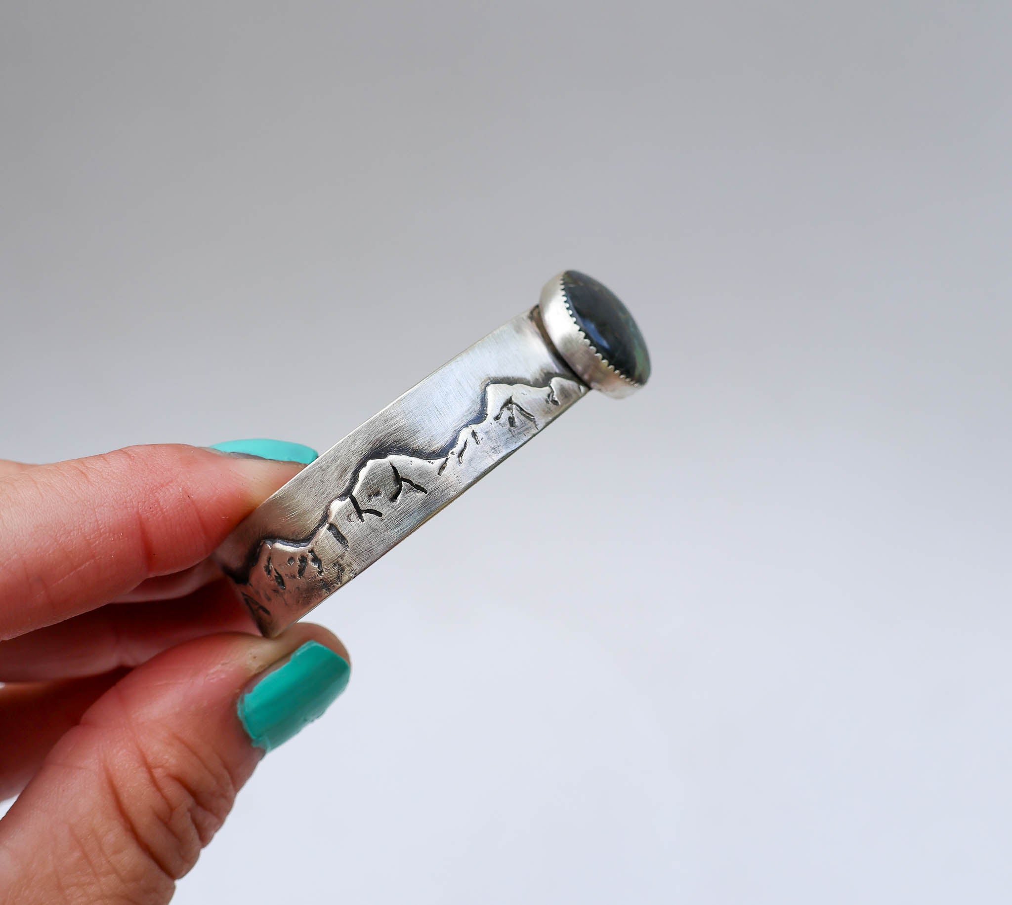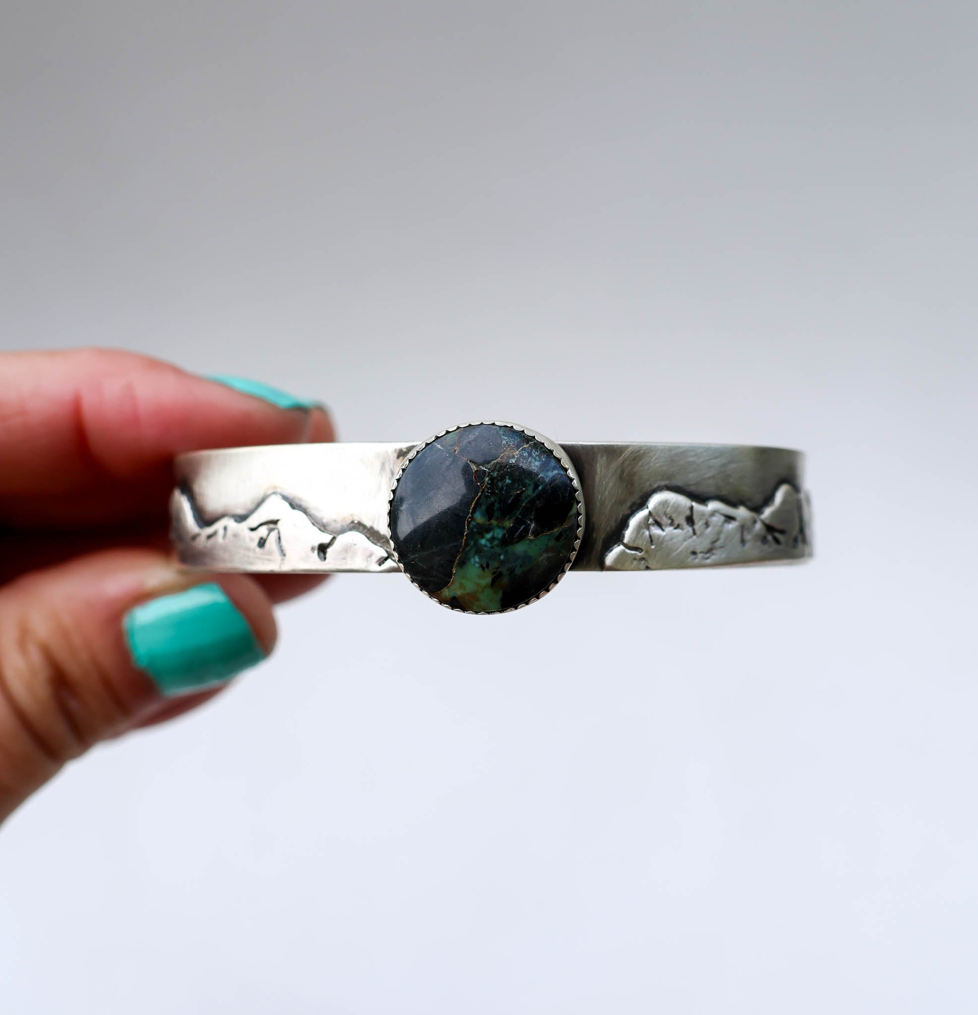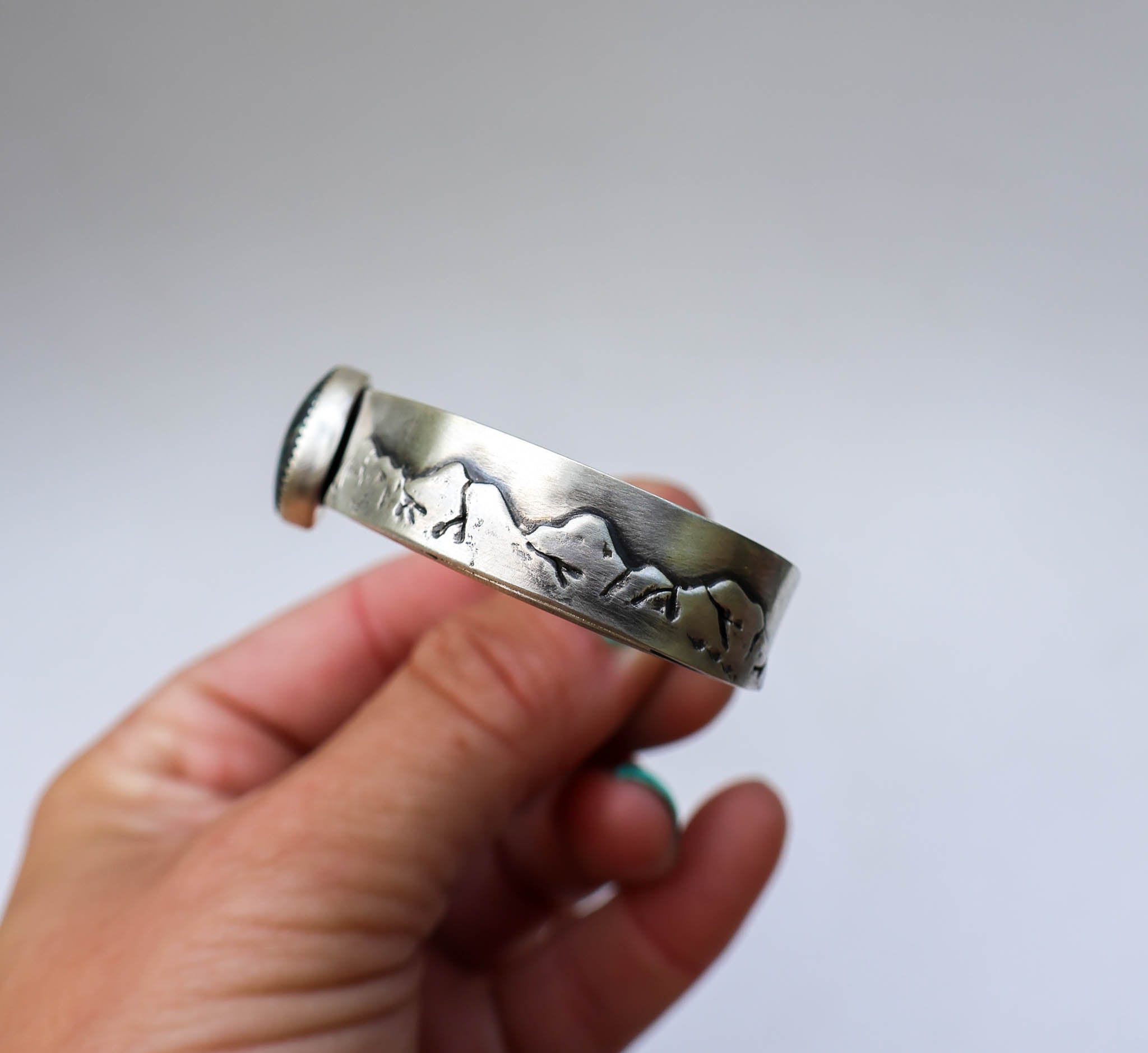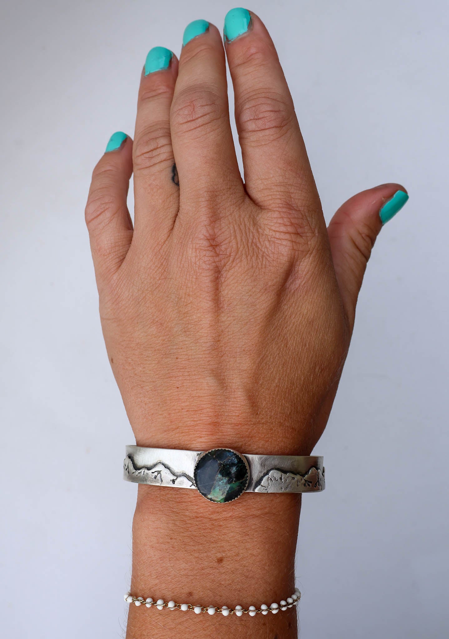 Made from 925 Sterling Silver and a 6 gauge thick sterling silver band. This cuff is a size medium, measuring 5" with a 2" gap. This will fit an 'average' typical women's wrist size, and is slightly adjustable for a comfort fit.