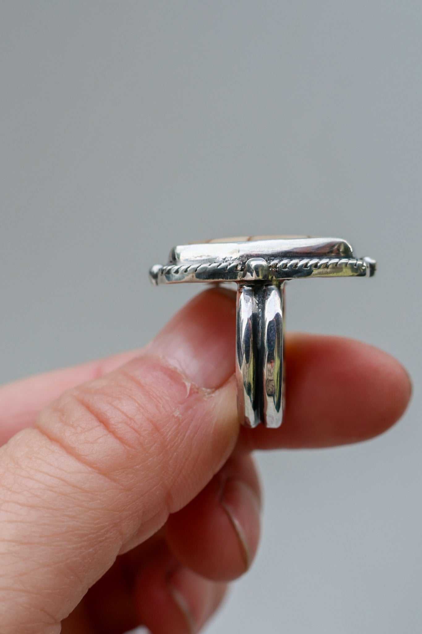 Handmade from sterling silver sheet and wire using traditional silversmithing methods. Products are not perfect, you may see a tool mark, and solder lines here and there, but that is what gives each piece its own unique charm.