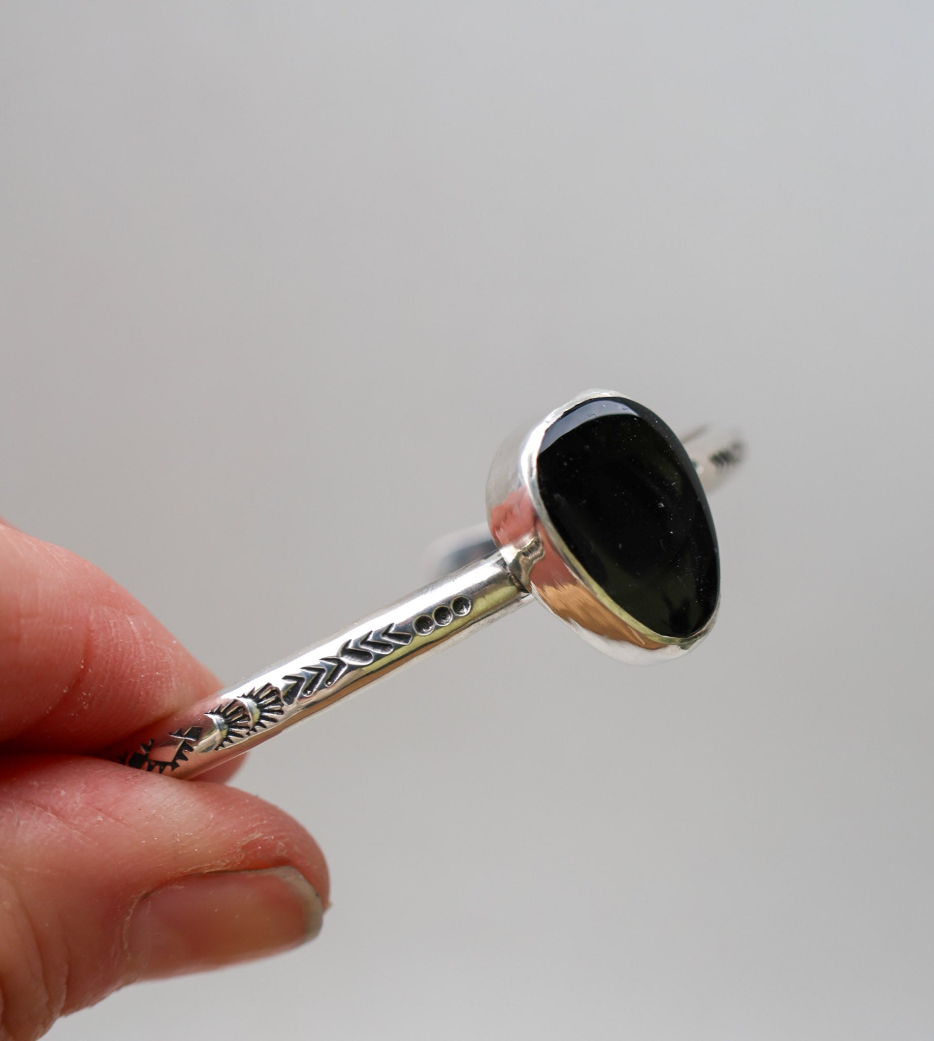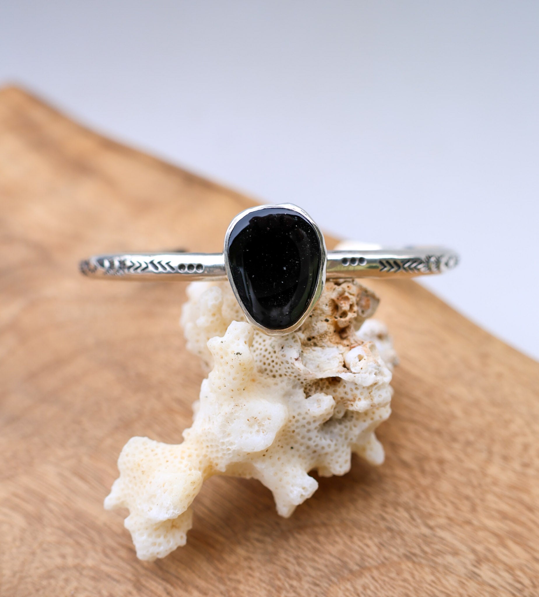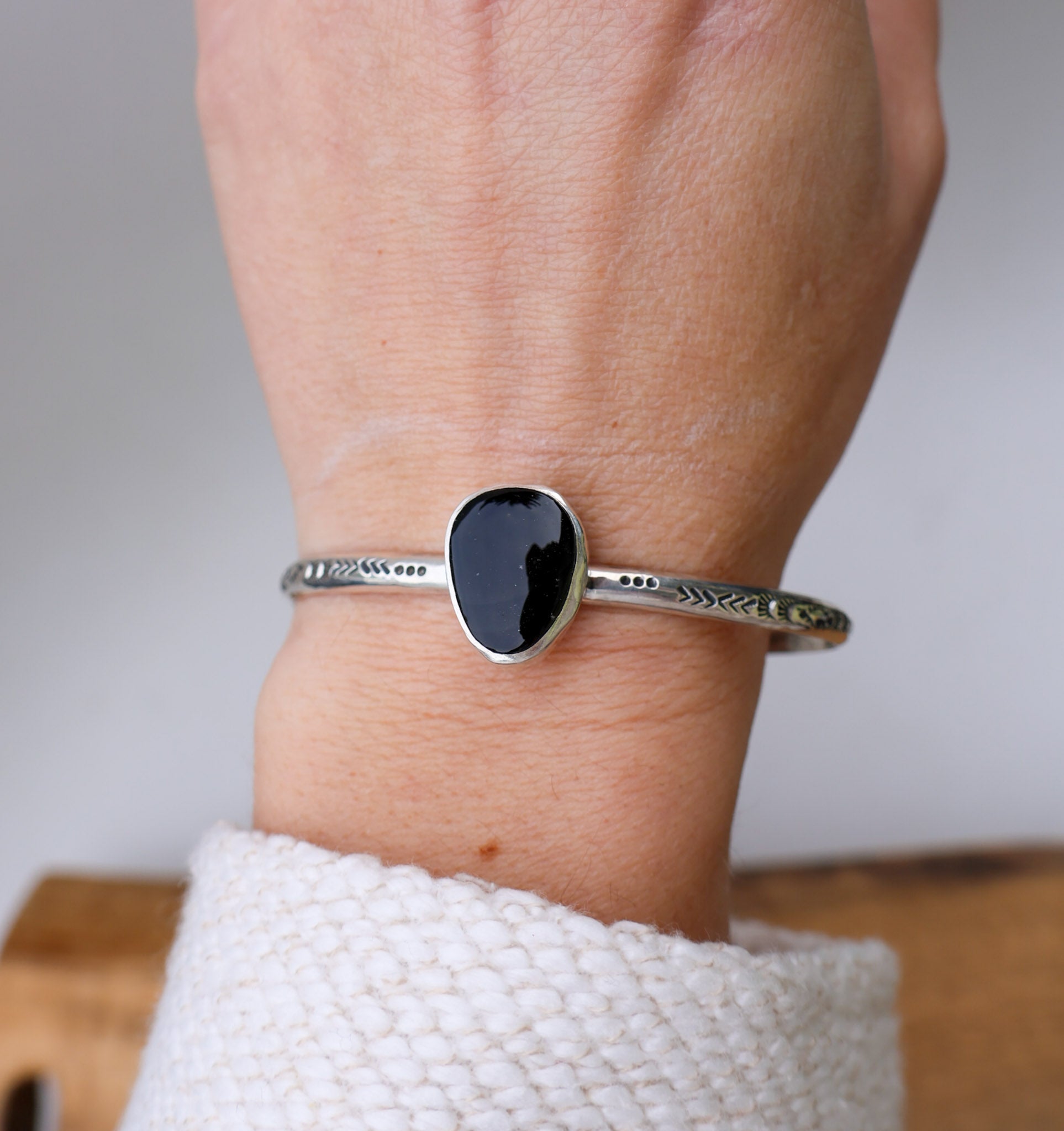 Made from 925 Sterling Silver and a 6 gauge thick sterling silver band. This cuff is a size medium, measuring 5.5” with a 1” gap. This will fit an ‘average’ typical women’s wrist size, and is slightly adjustable for a comfort fit.