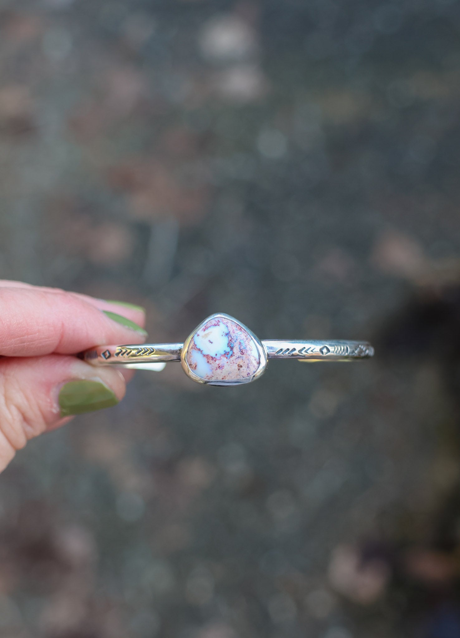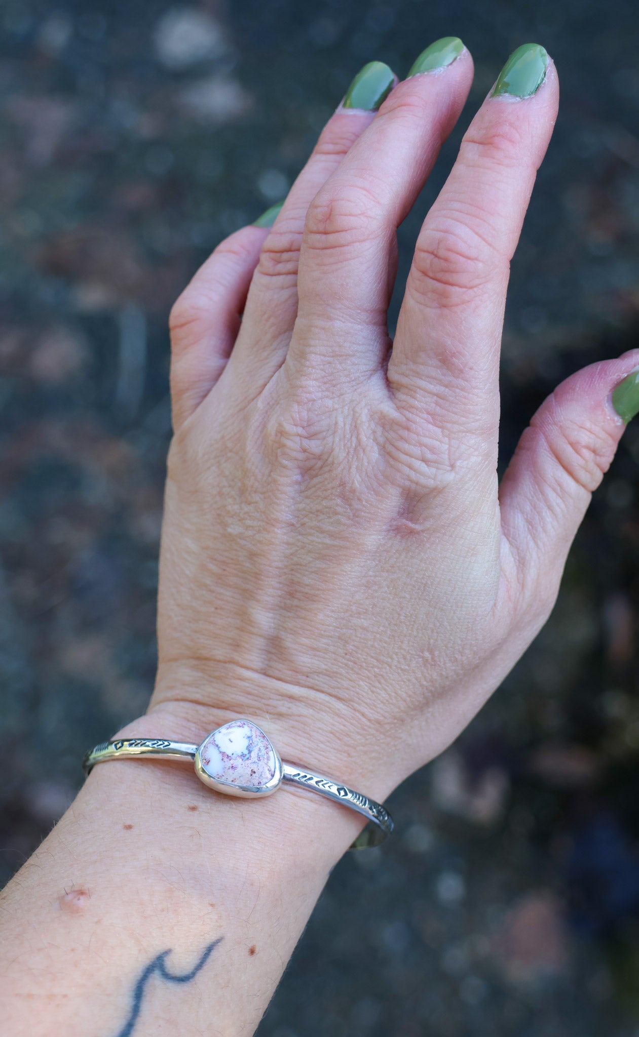 Made from 925 Sterling Silver and a 6 gauge thick sterling silver band. This cuff is a size medium, measuring 5.5” with a 1” gap. This will fit an ‘average’ typical women’s wrist size, and is slightly adjustable for a comfort fit.