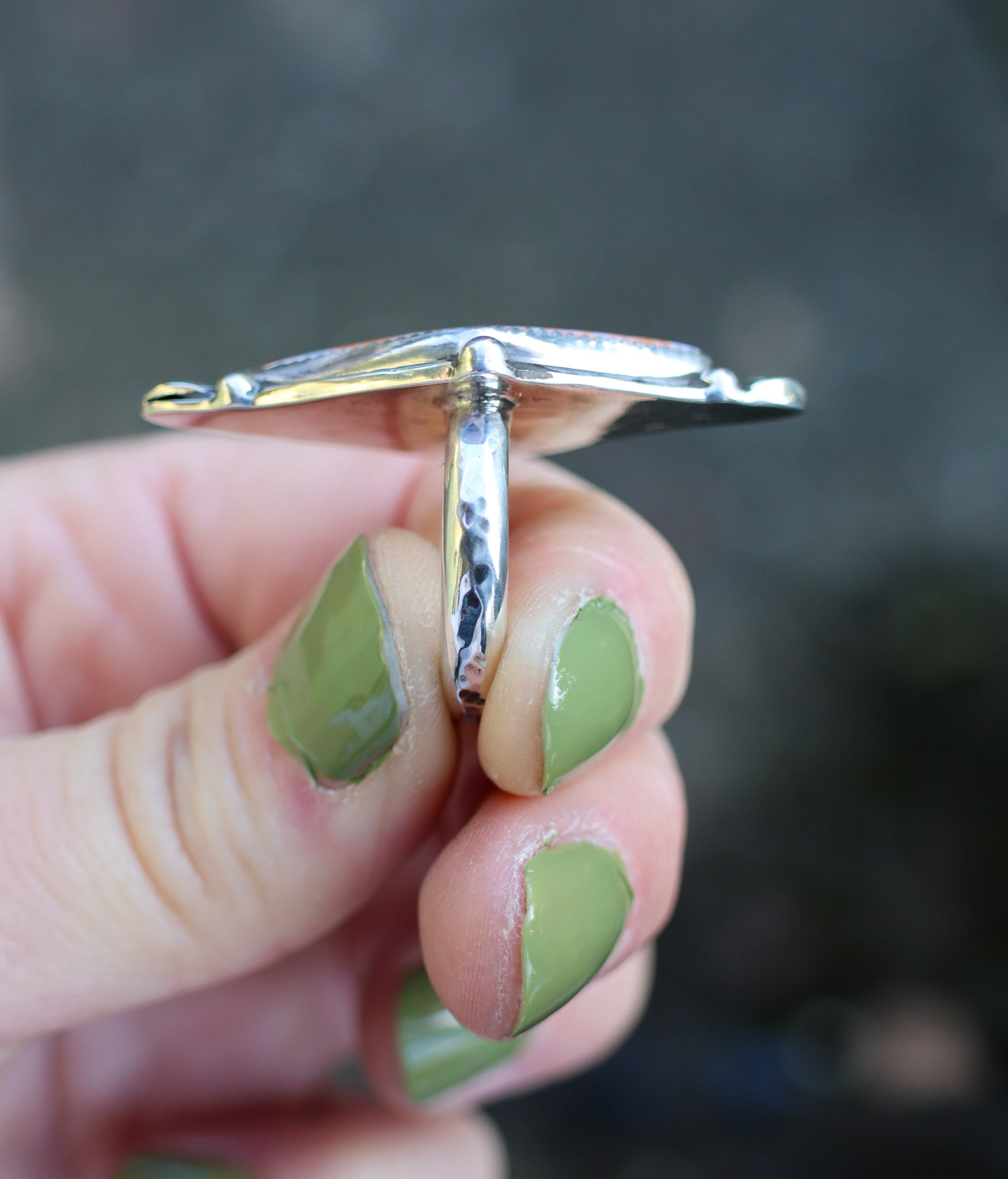 Handmade from sterling silver sheet and wire using traditional silversmithing methods. Products are not perfect, you may see a tool mark, and solder lines here and there, but that is what gives each piece its own unique charm.