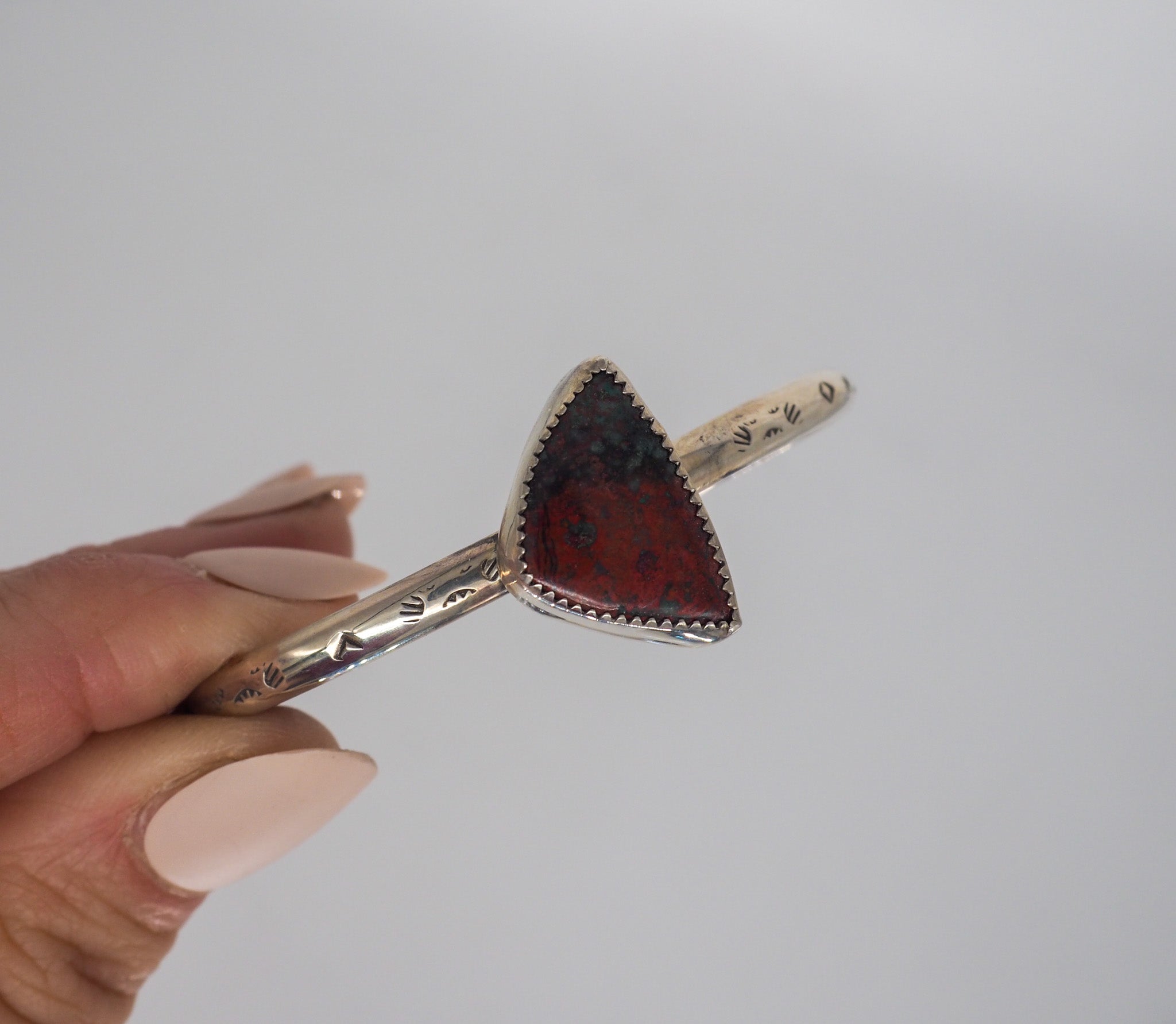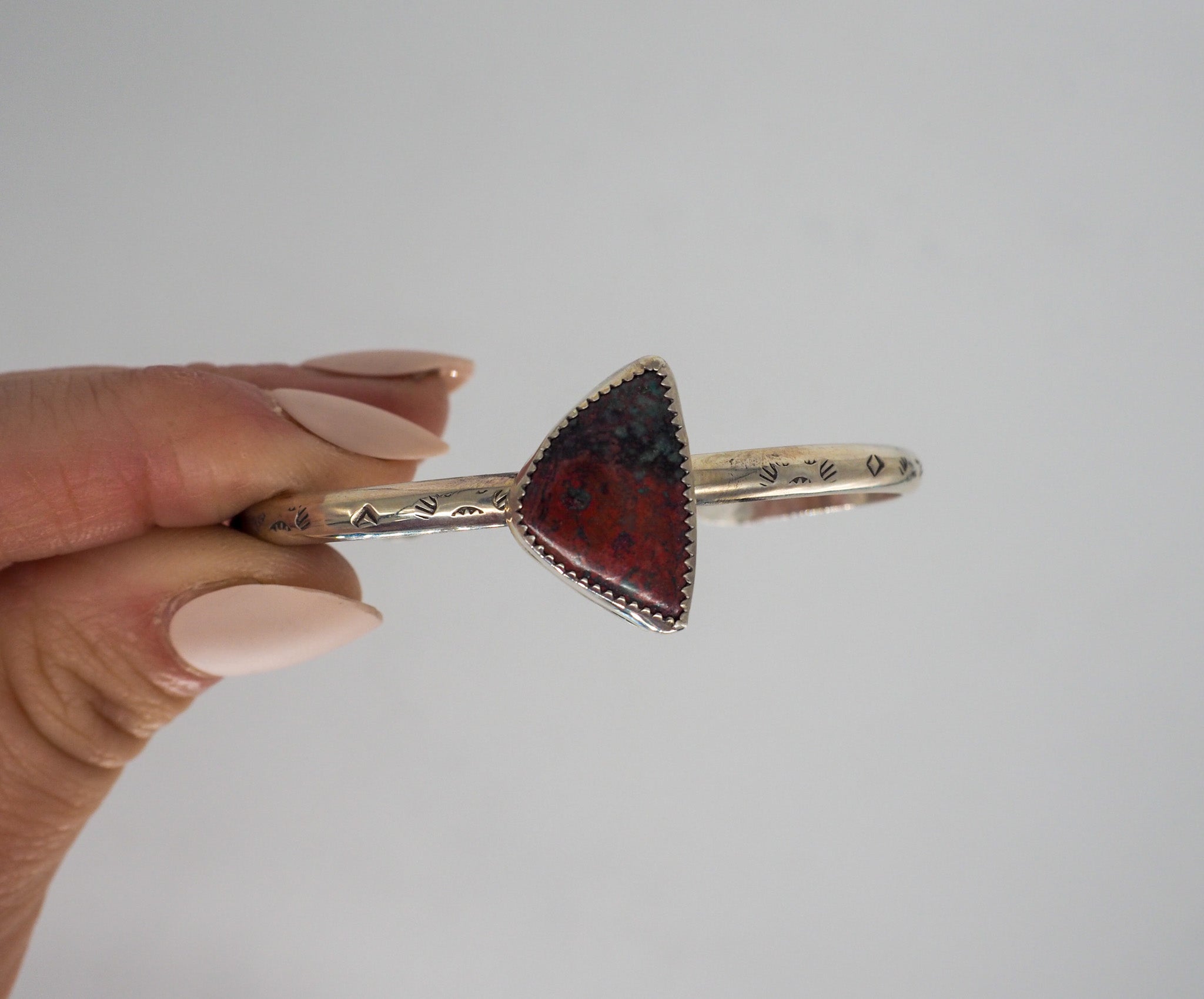 Made from 925 Sterling Silver and a 6 gauge thick sterling silver band. This cuff is a size medium, measuring 5.5” with a 1” gap. This will fit an ‘average’ typical women’s wrist size, and is slightly adjustable for a comfort fit.