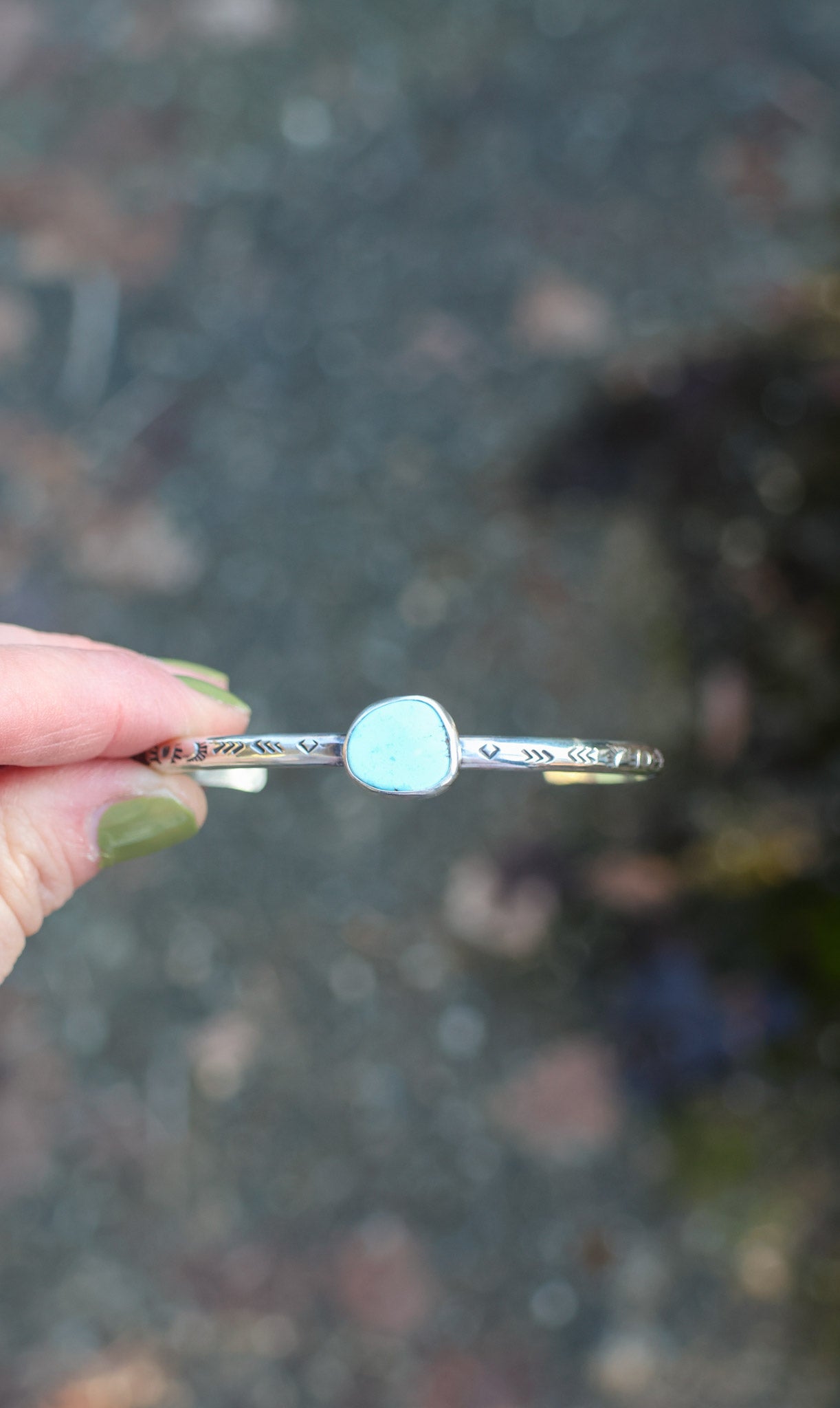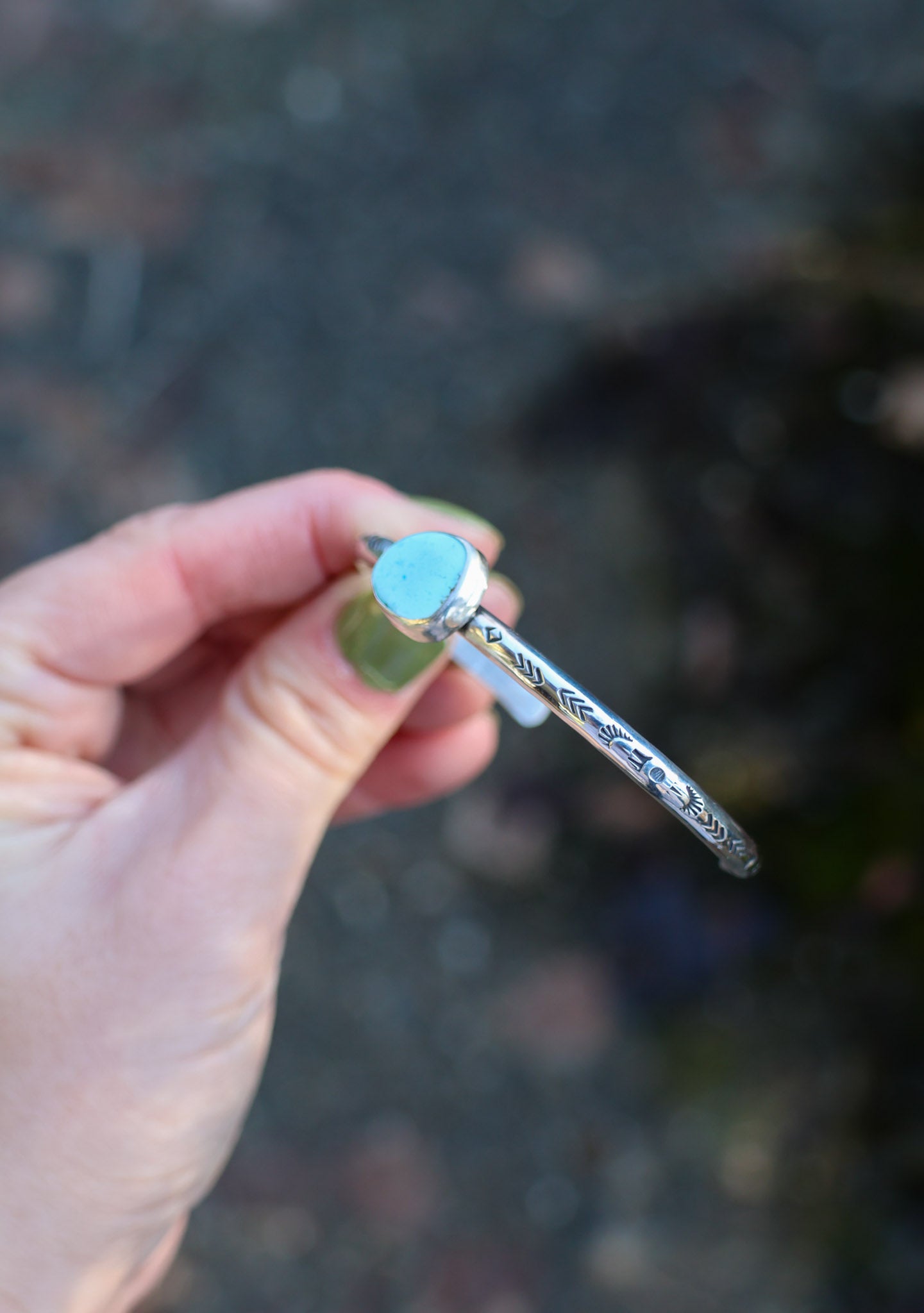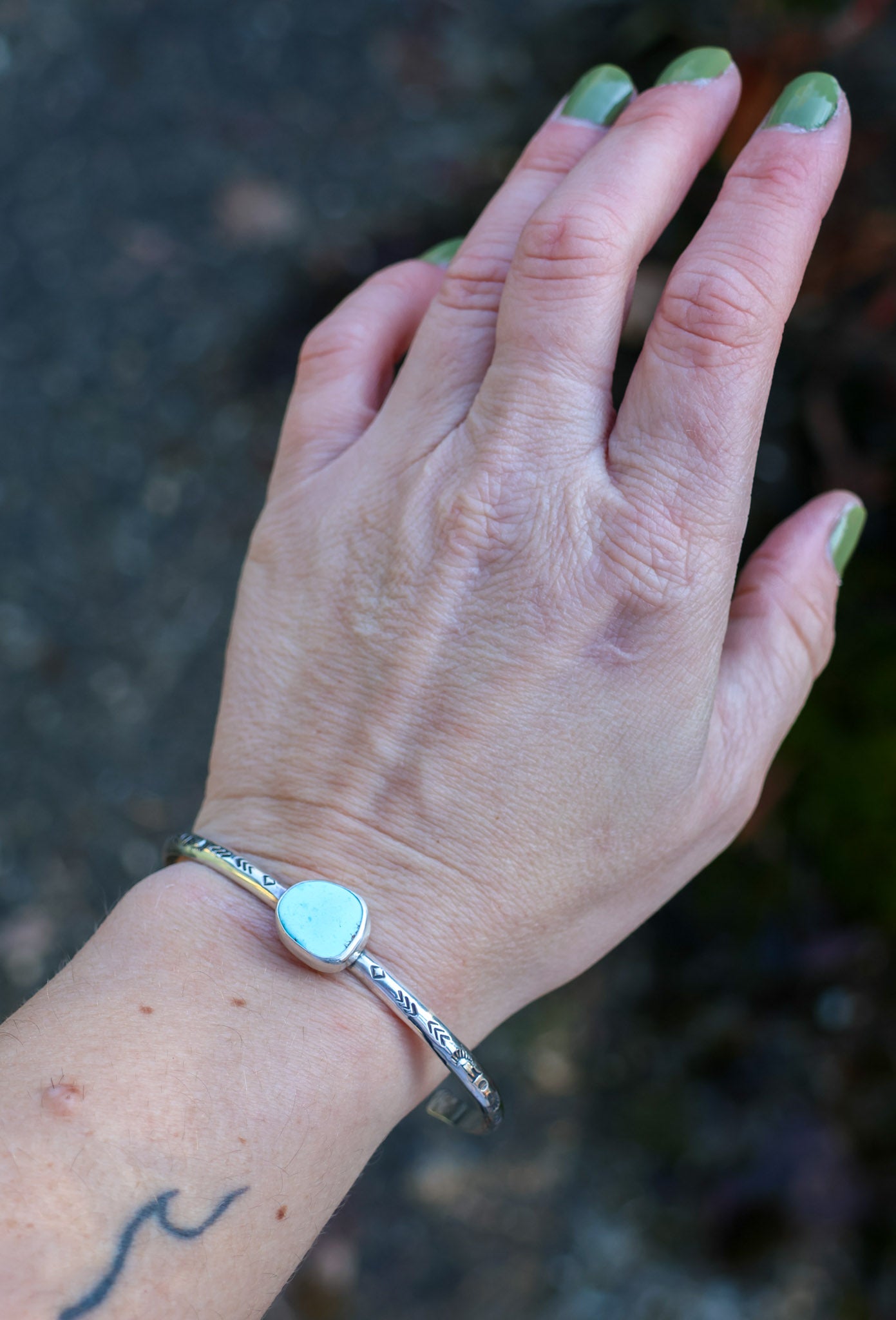 Made from 925 Sterling Silver and a 6 gauge thick sterling silver band. This cuff is a size medium, measuring 5.5” with a 1” gap. This will fit an ‘average’ typical women’s wrist size, and is slightly adjustable for a comfort fit.
