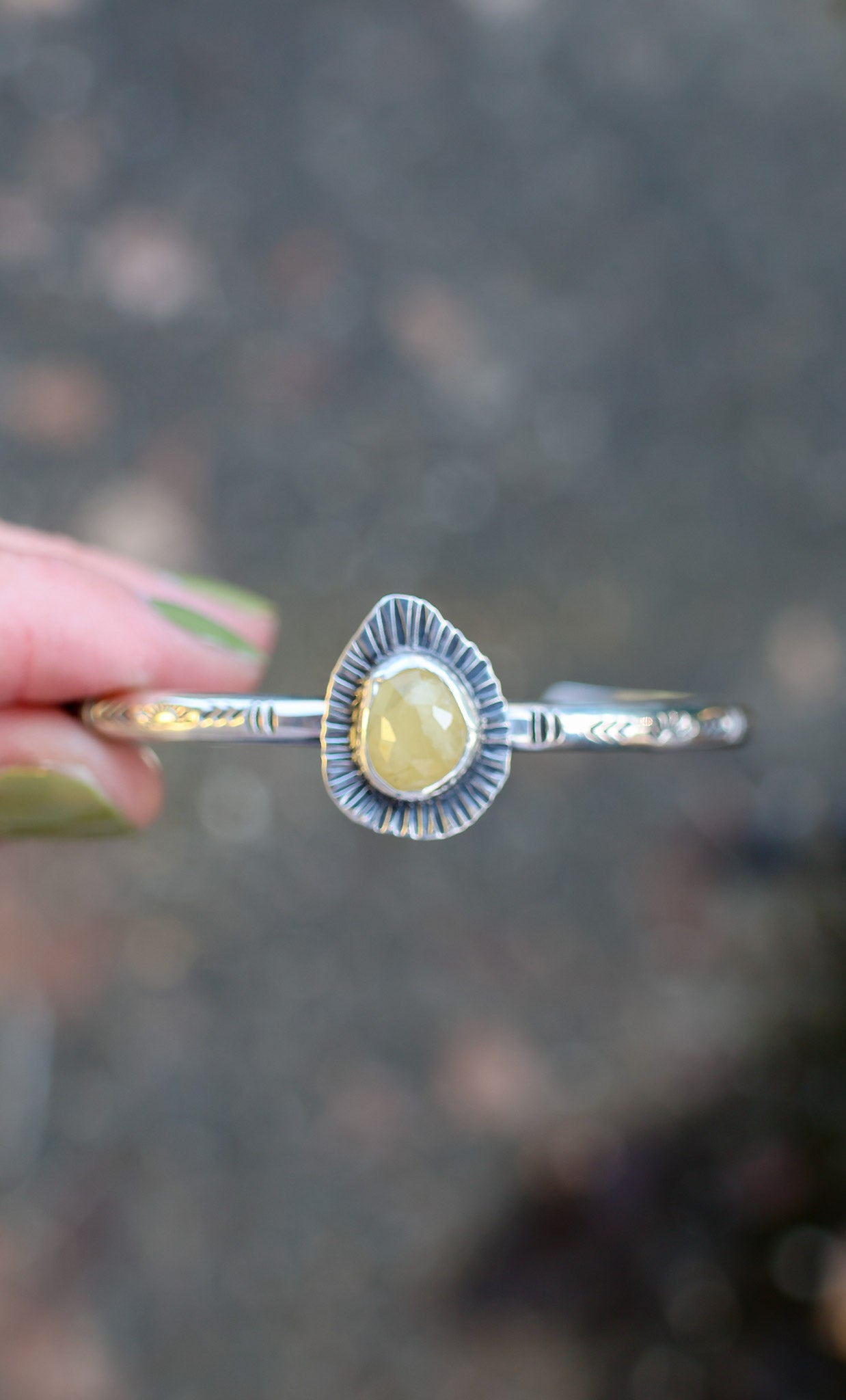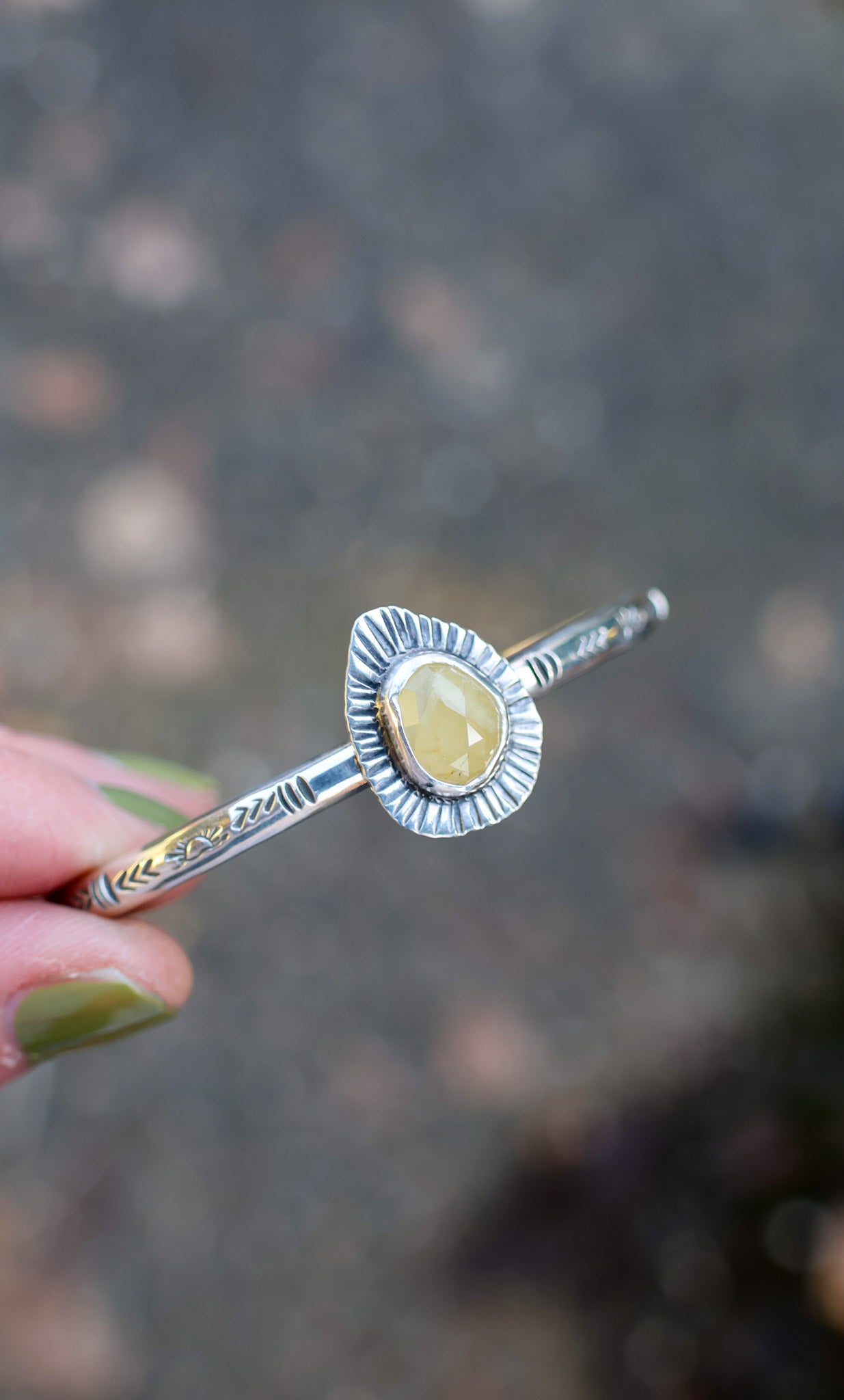 Made from 925 Sterling Silver and a 6 gauge thick sterling silver band. This cuff is a size medium, measuring 5.5” with a 1” gap. This will fit an ‘average’ typical women’s wrist size, and is slightly adjustable for a comfort fit.