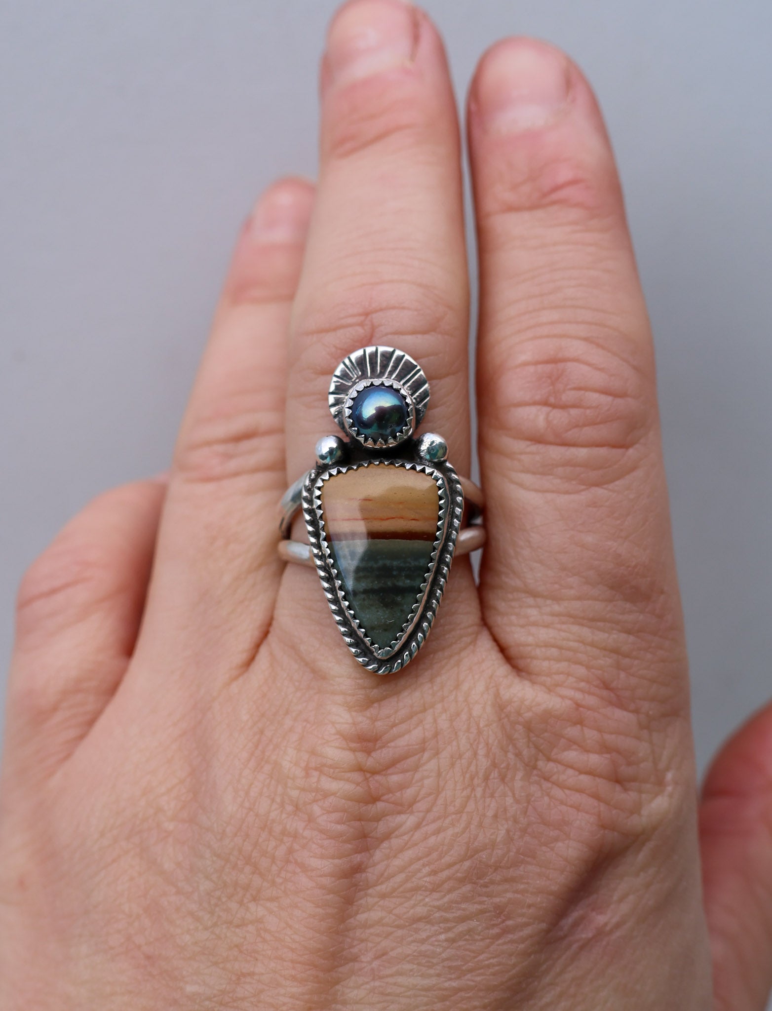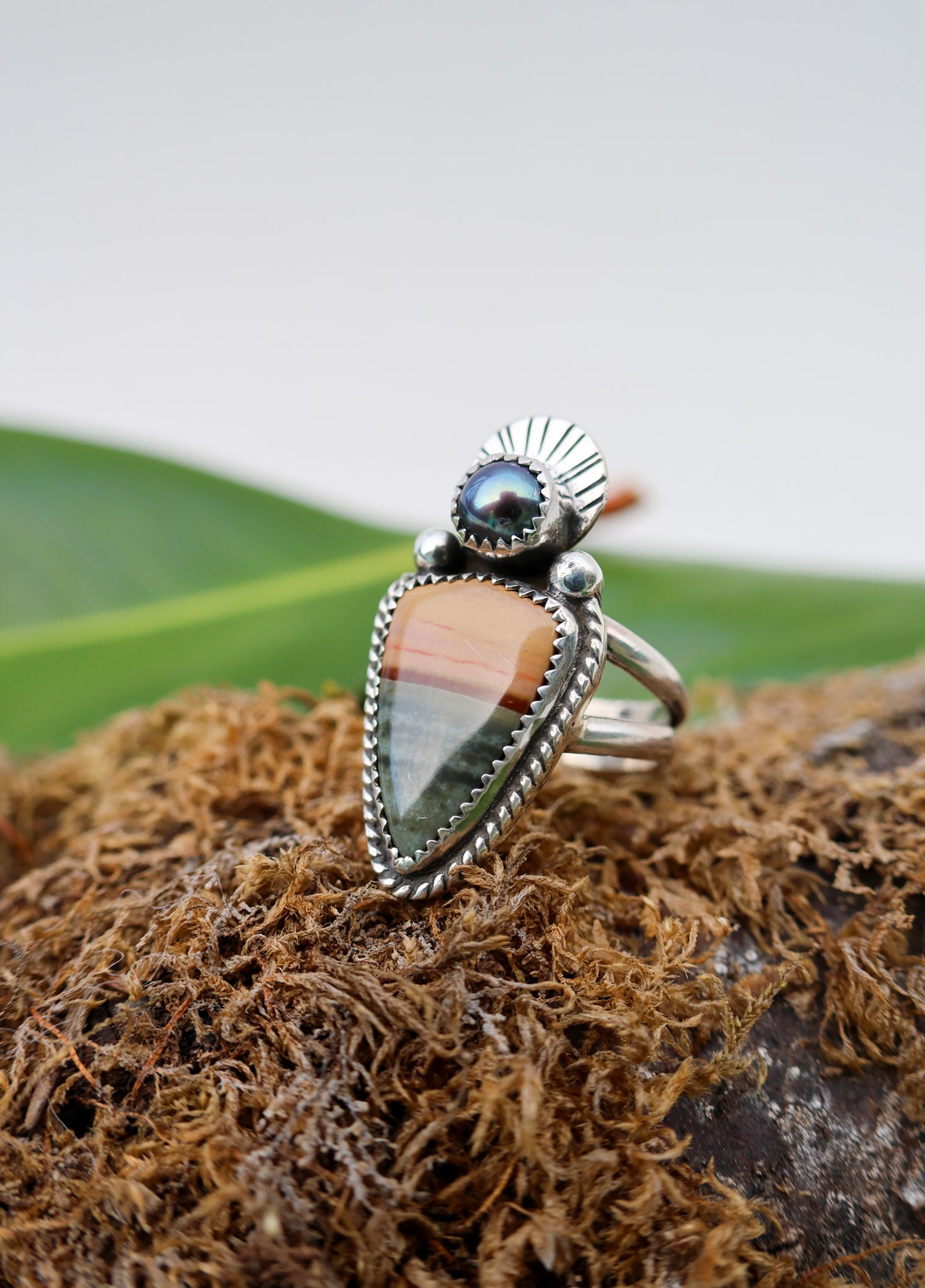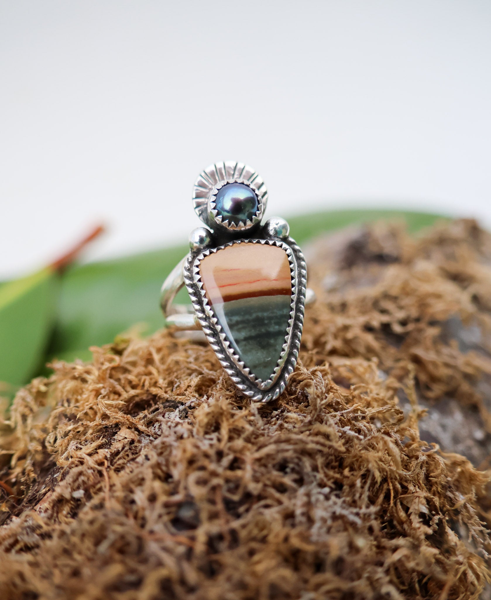 Made with a Polychrome Jasper , Black Pearl & Sterling Silver