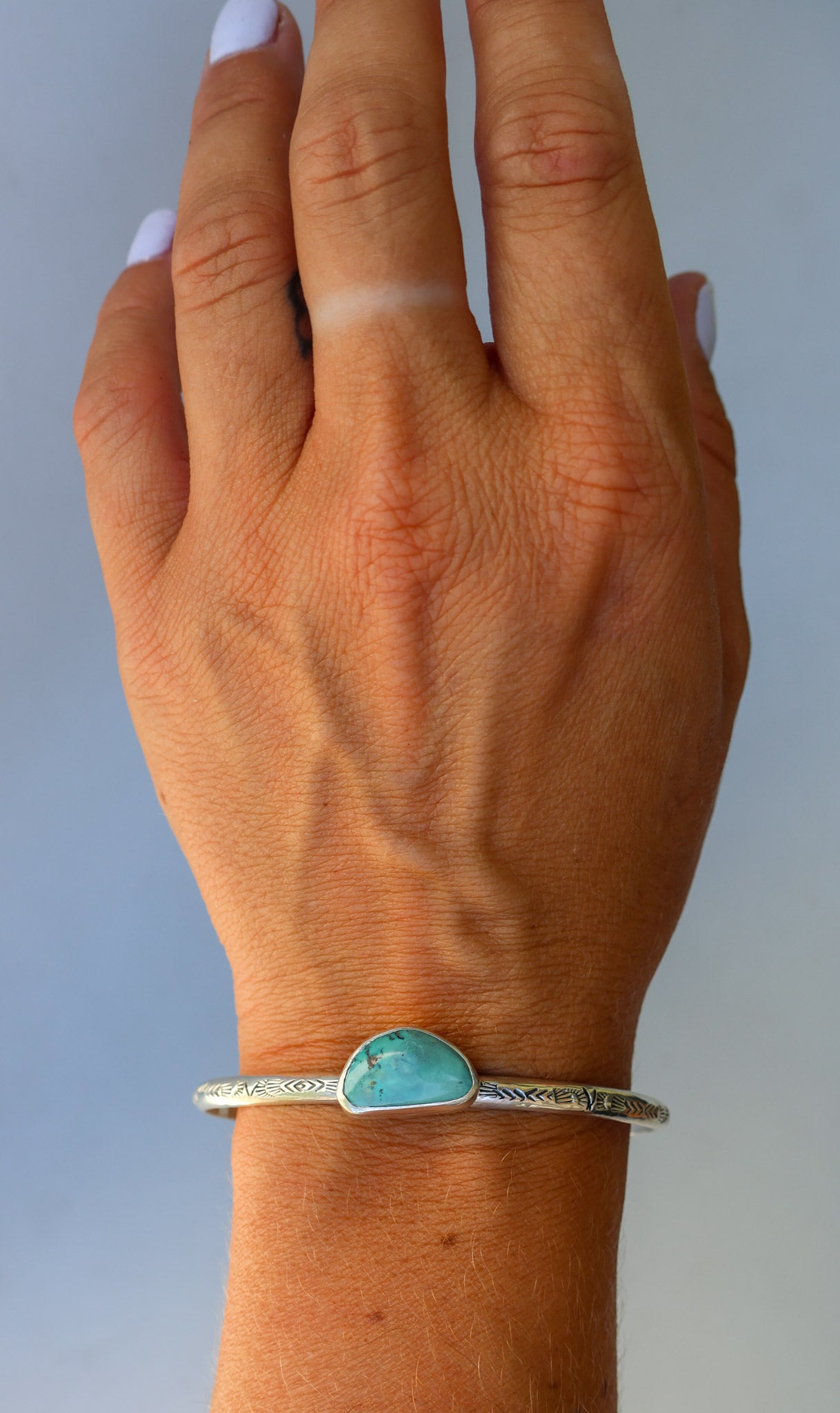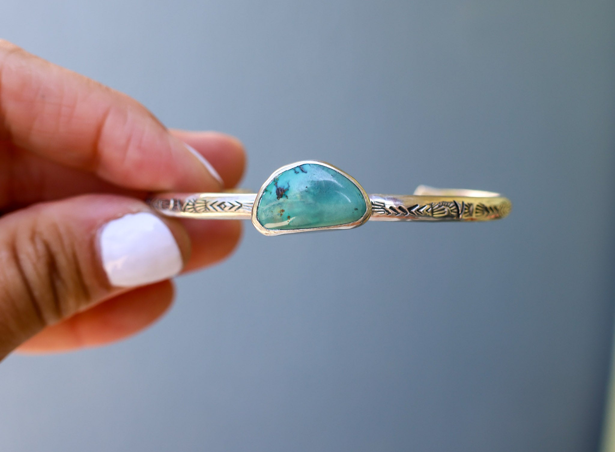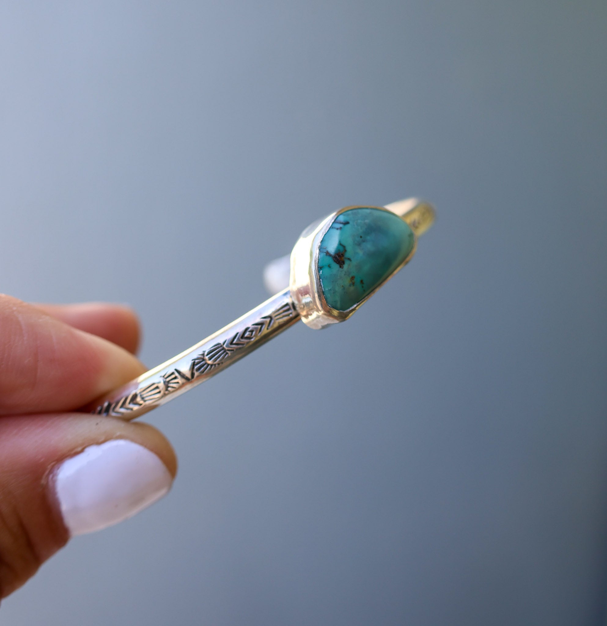 Made from 925 Sterling Silver and a 6 gauge thick sterling silver band. This cuff is a size small/medium , measuring 5" with a 1.5” gap. This will fit a small/medium women’s wrist size, and the cuff is adjustable.