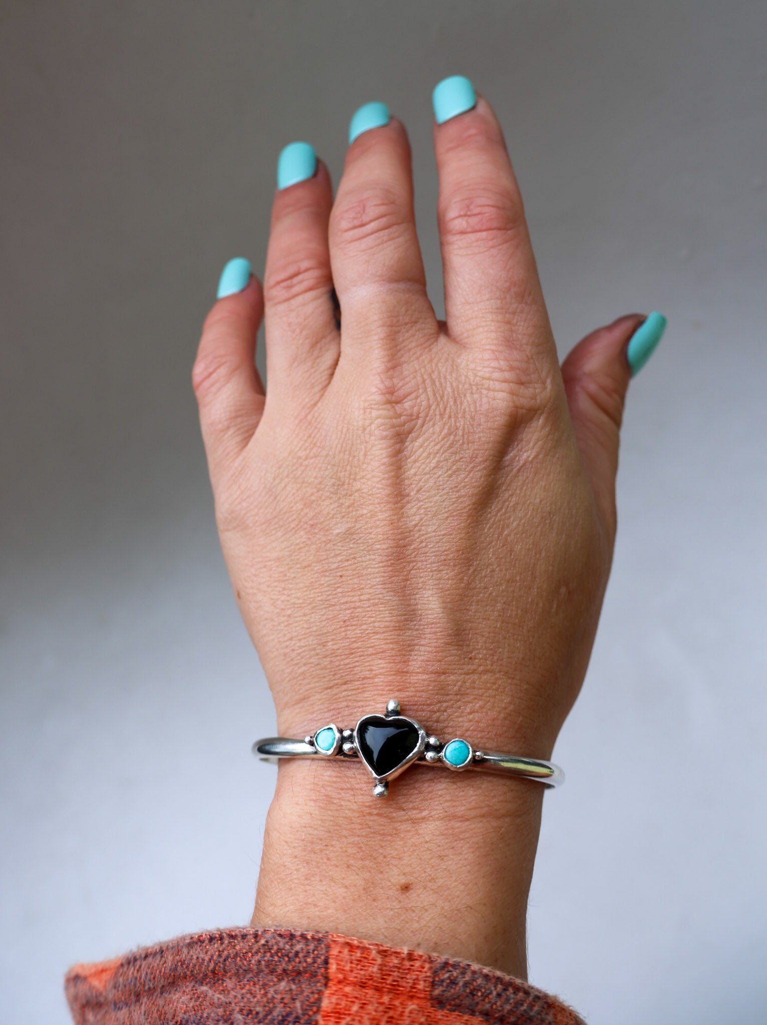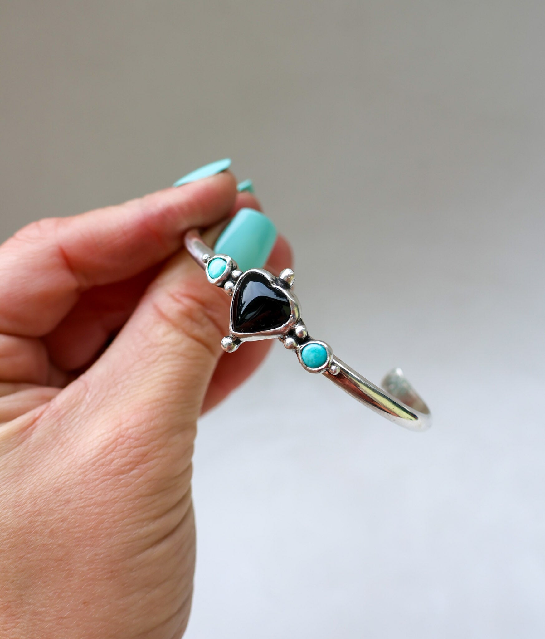 Made from 925 Sterling Silver and a 6 gauge thick sterling silver band. This cuff is a size medium , measuring 5.5” with a 1.5” gap. This will fit an ‘average’ typical women’s wrist size, and is slightly adjustable for a comfort fit.