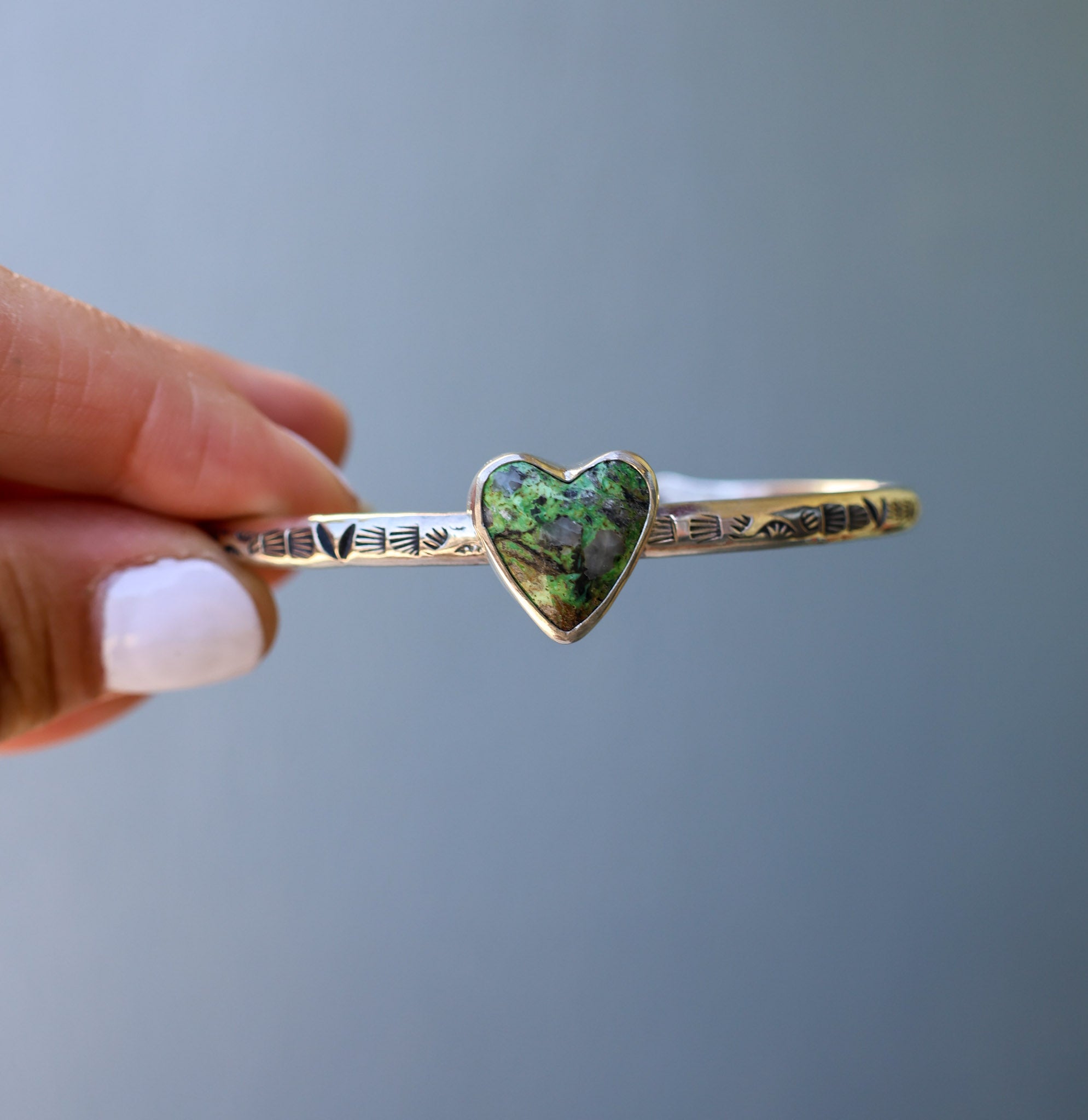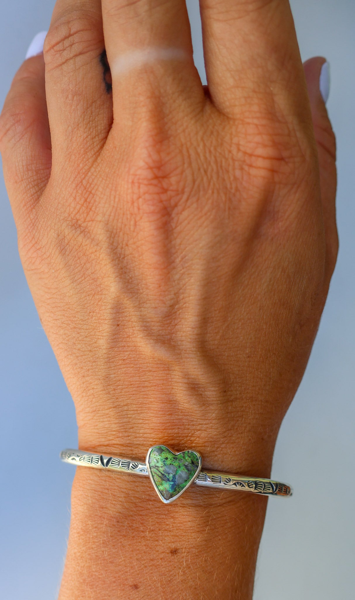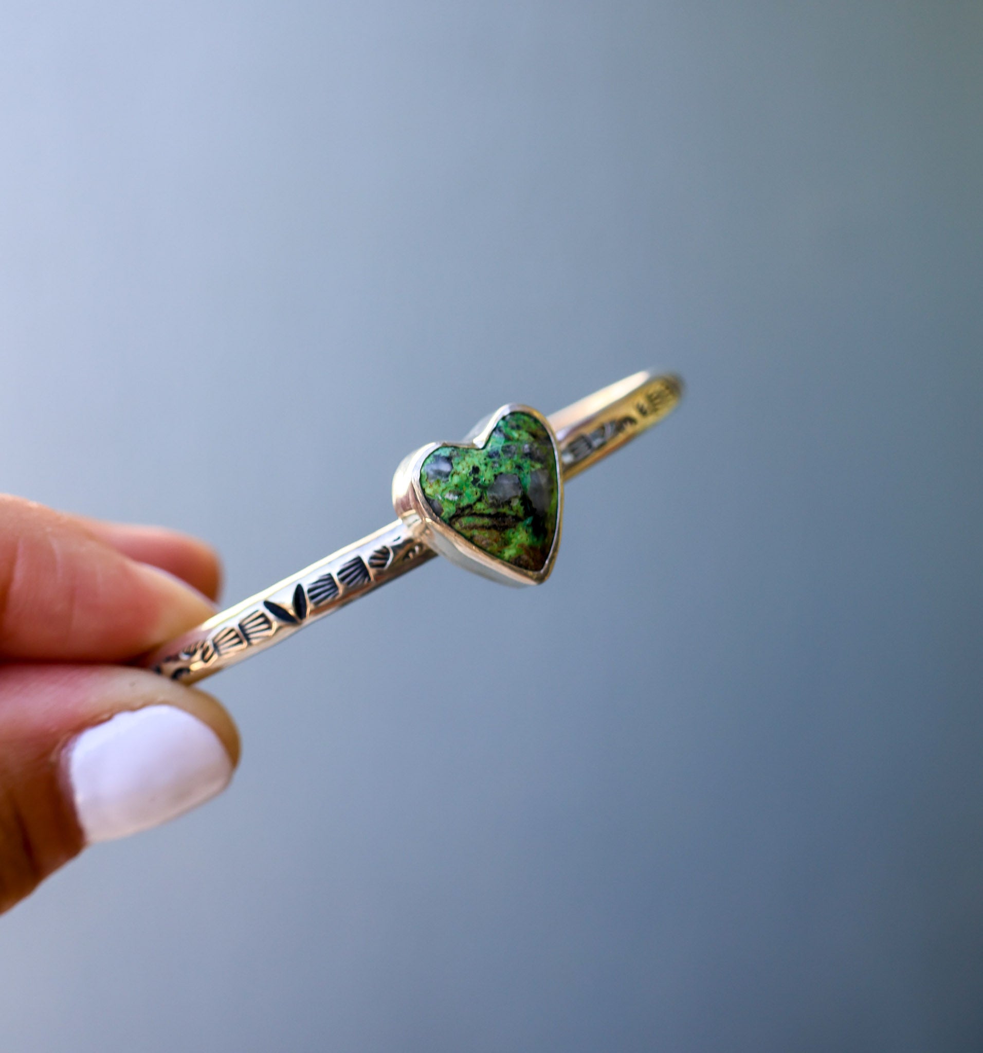 Made from 925 Sterling Silver and a 6 gauge thick sterling silver band. This cuff is a size small/medium , measuring 5" with a 1.5” gap. This will fit a small/medium women’s wrist size, and the cuff is adjustable.