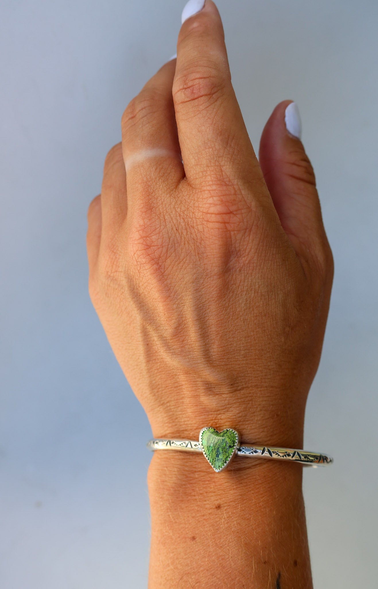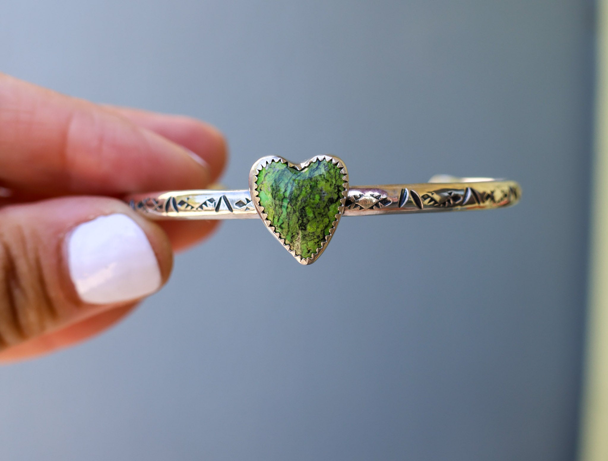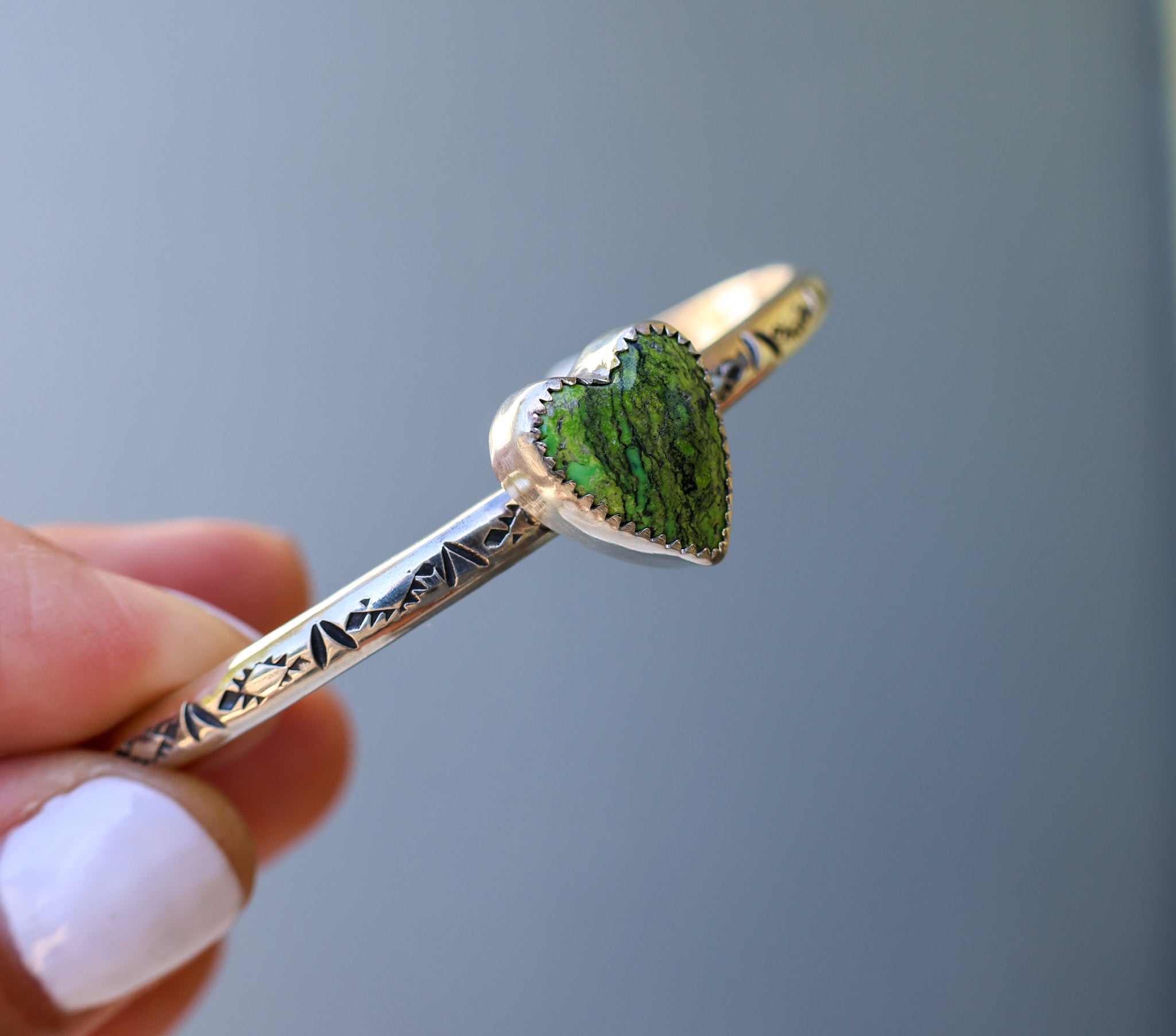 Made from 925 Sterling Silver and a 6 gauge thick sterling silver band. This cuff is a size small/medium , measuring 5" with a 1.5” gap. This will fit a small/medium women’s wrist size, and the cuff is adjustable.