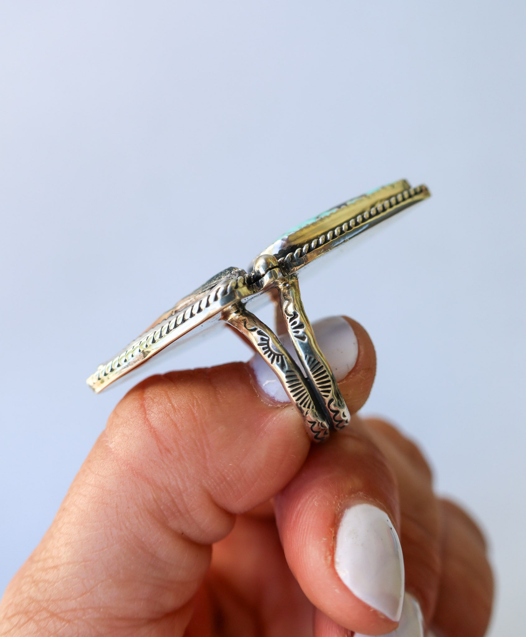Handmade from sterling silver sheet and wire using traditional silversmithing methods. Products are not perfect, you may see a tool mark, and solder lines here and there, but that is what gives each piece its own unique charm.