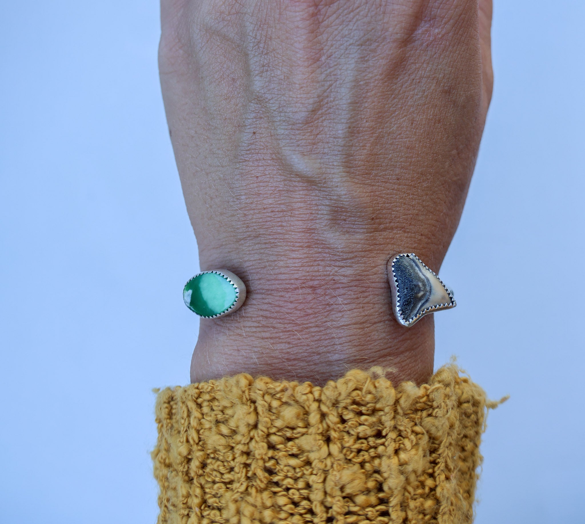 Made from 925 Sterling Silver and a 6 gauge thick sterling silver band. This cuff is a size small/medium measuring 5.5” with a 2” inch gap. Slightly adjustable for a comfort fit.