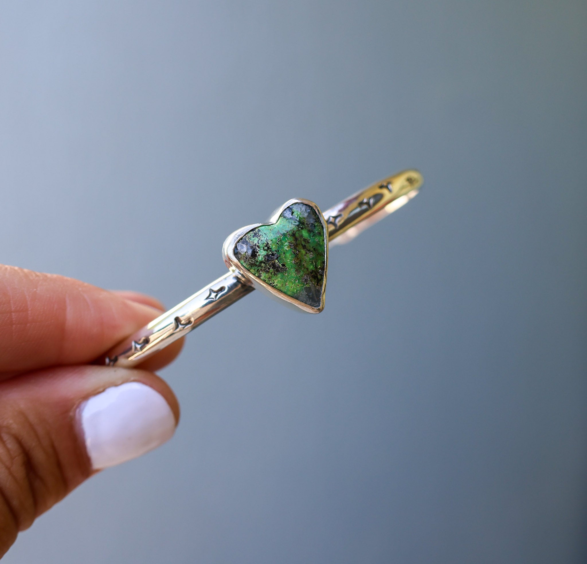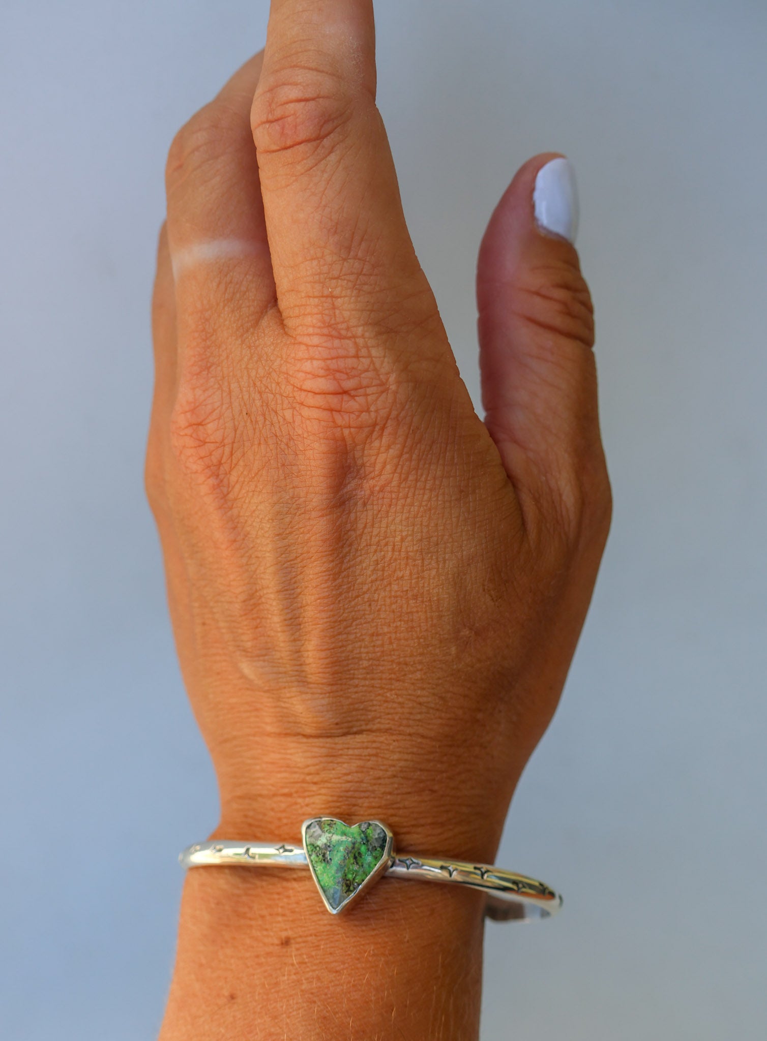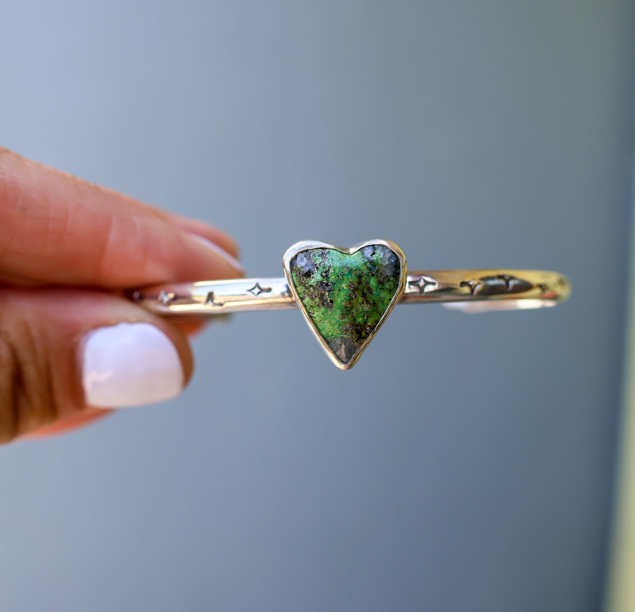 Made from 925 Sterling Silver and a 6 gauge thick sterling silver band. This cuff is a size small/medium , measuring 5" with a 1.5” gap. This will fit a small/medium women’s wrist size, and the cuff is adjustable.