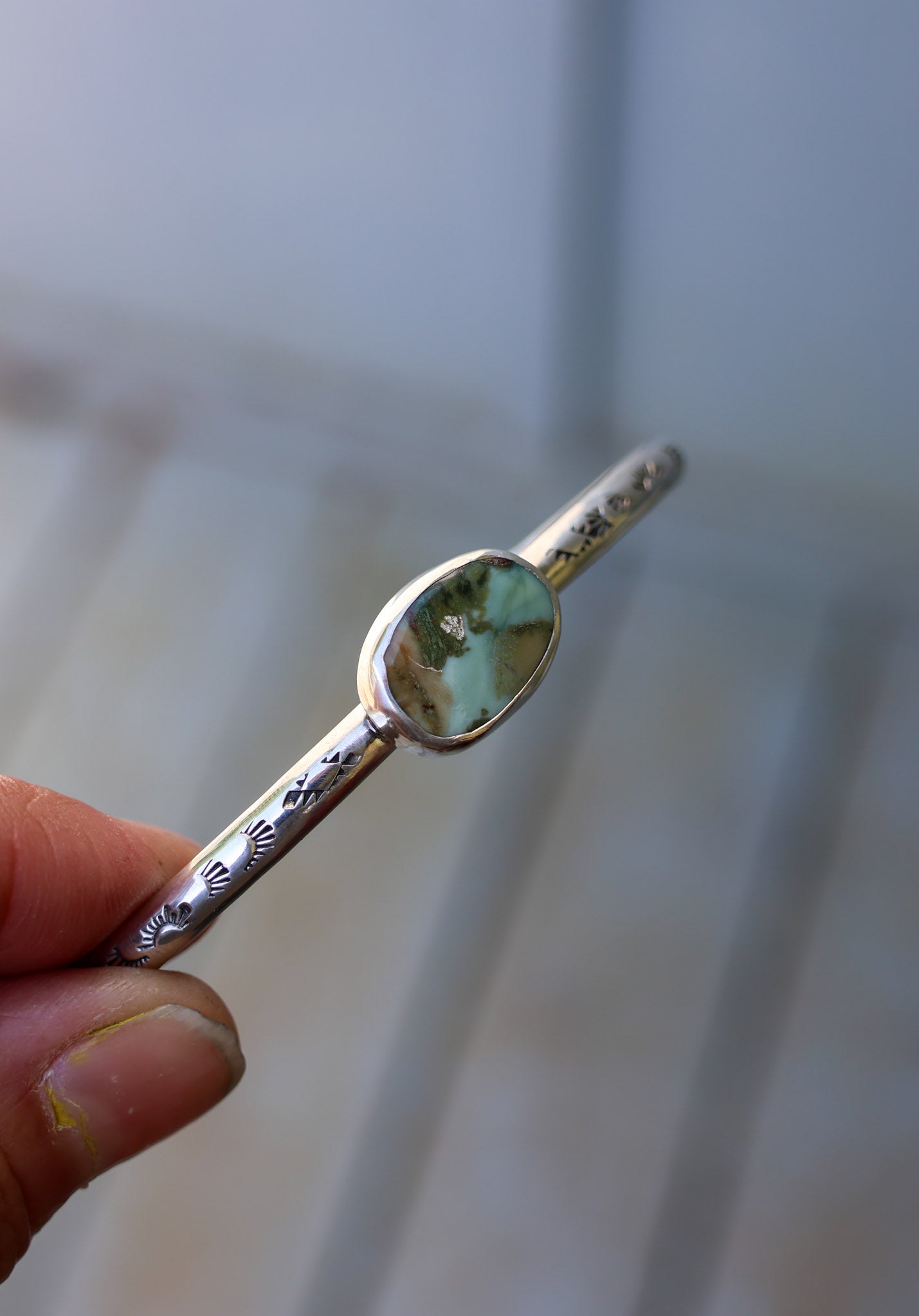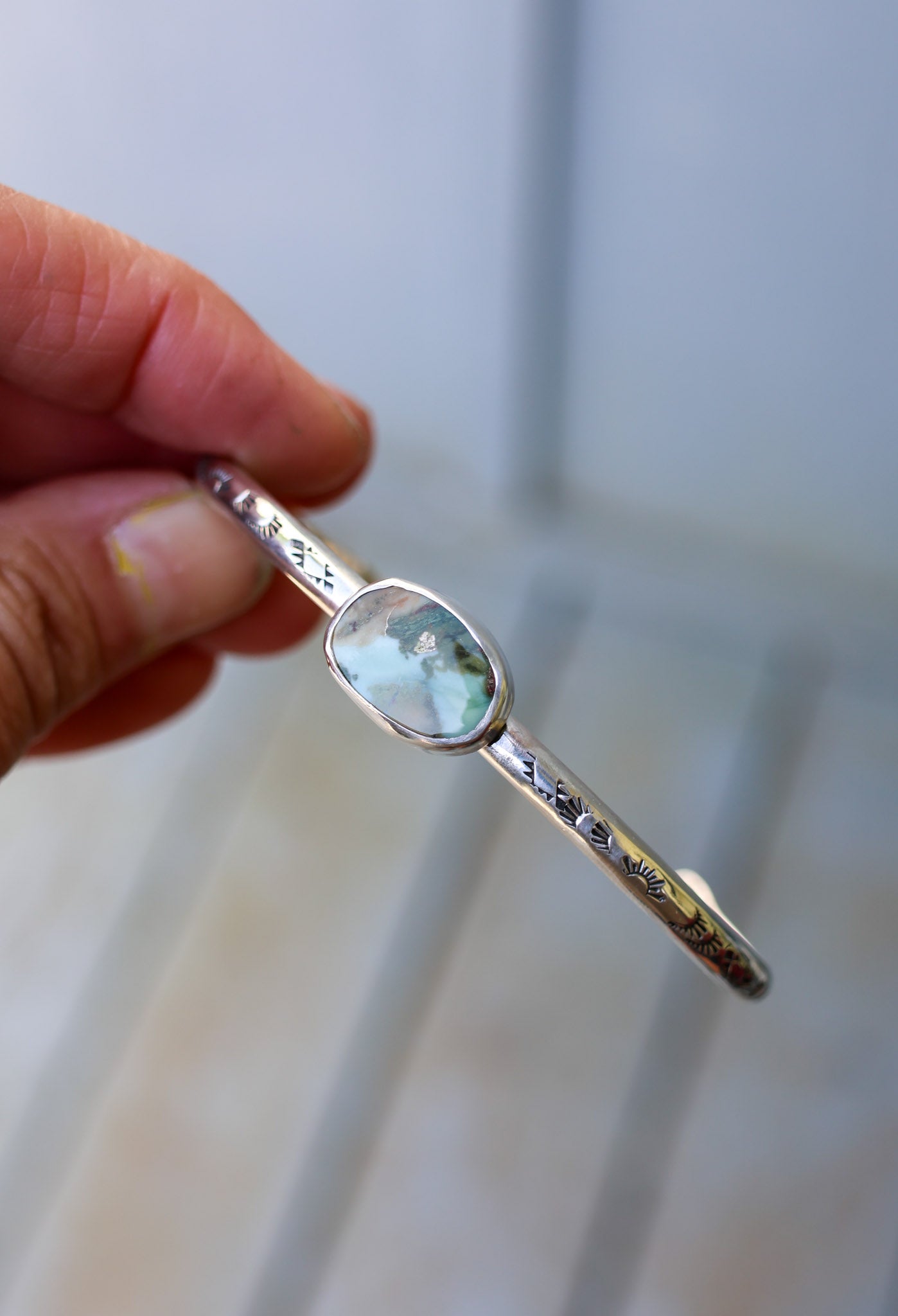 Made from 925 Sterling Silver and a 6 gauge thick sterling silver band. This cuff is a size medium , measuring 5.5” with a 2” gap. This will fit an ‘average’ typical women’s wrist size, and is slightly adjustable for a comfort fit.
