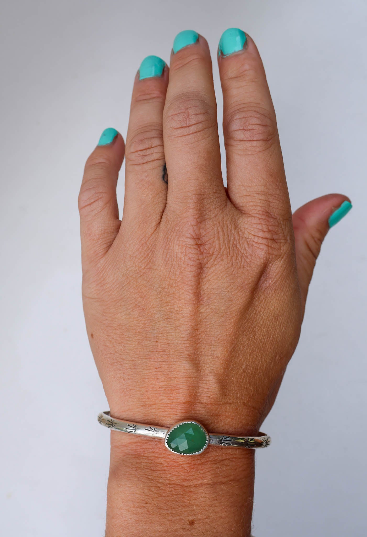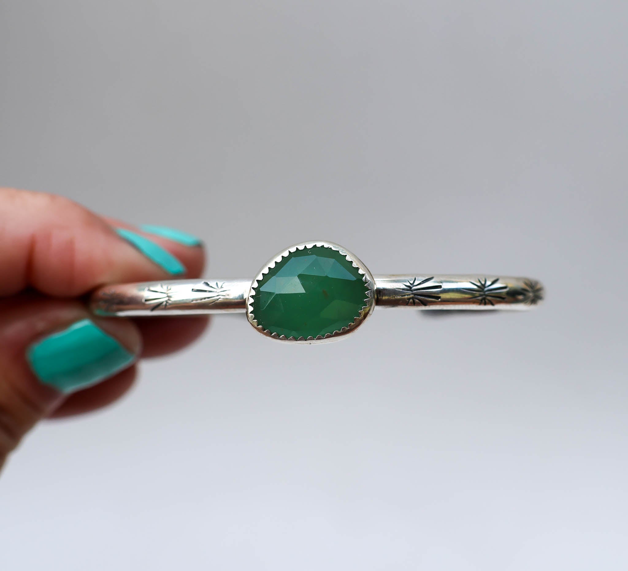 Handmade from sterling silver sheet and wire using traditional silversmithing methods. Products are not perfect, you may see a tool mark, and solder lines here and there, but that is what gives each piece its own unique charm.