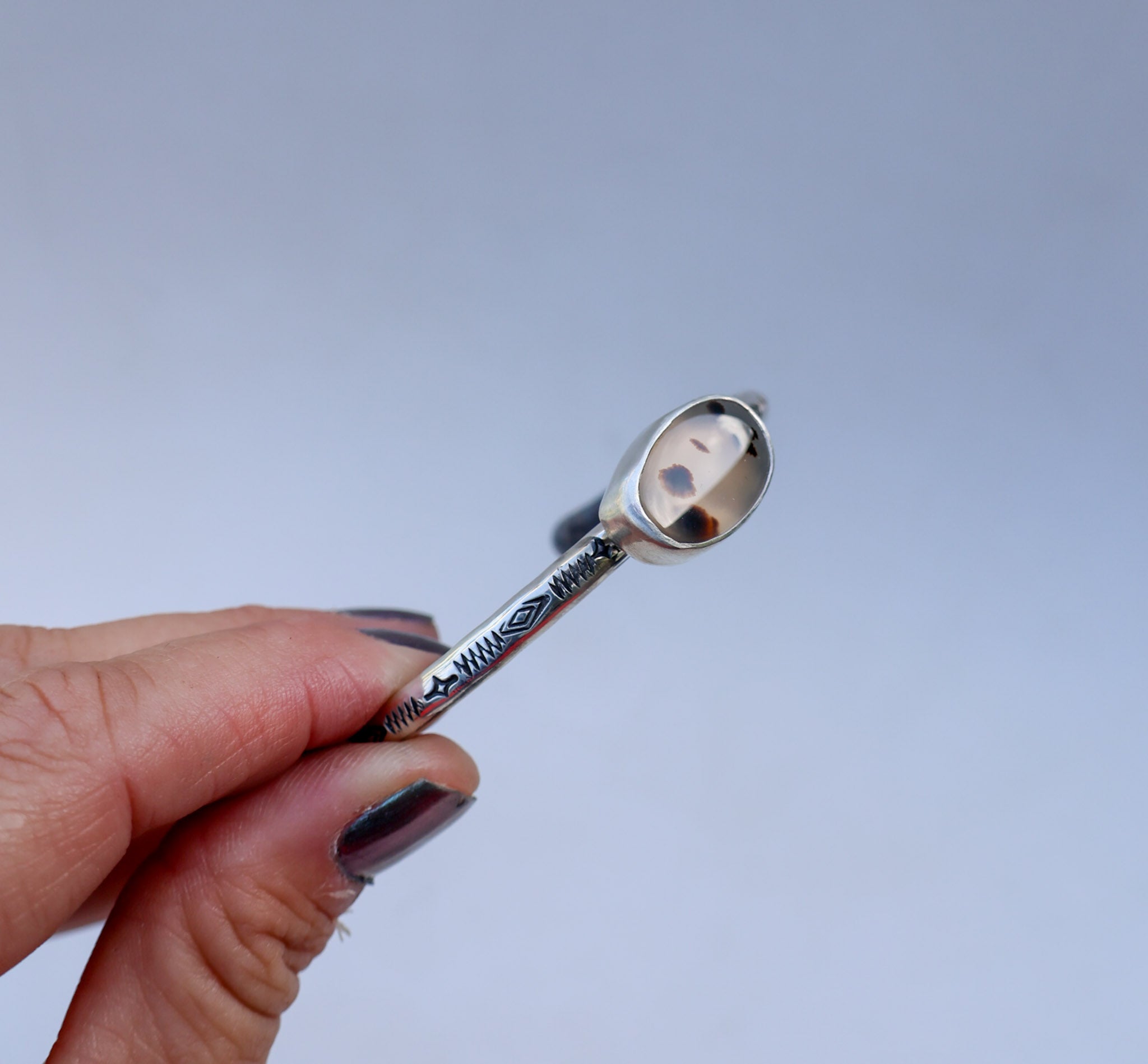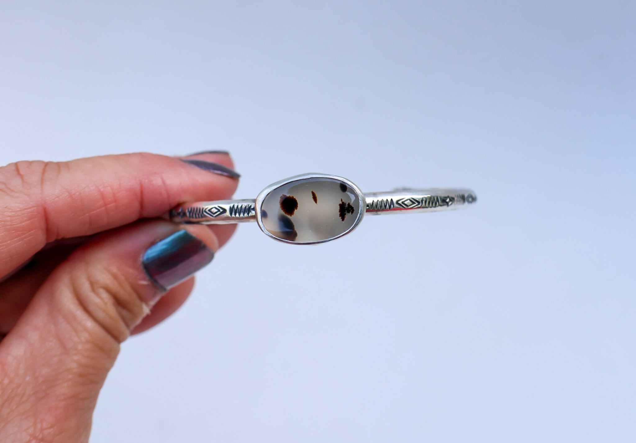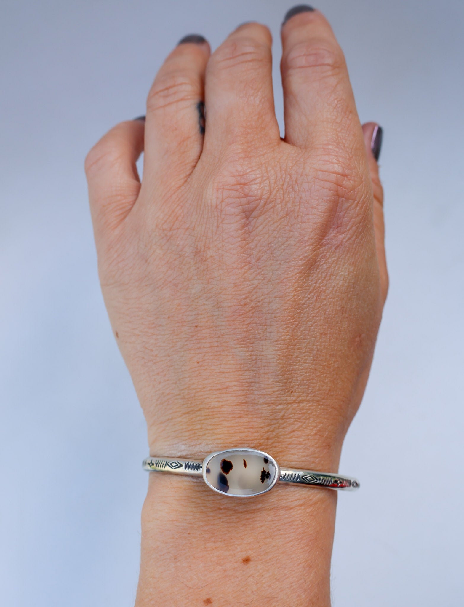 Made from 925 Sterling Silver and a 6 gauge thick sterling silver band. This cuff is a size medium, measuring 5.5” with a 1.5” gap. This will fit an ‘average’ typical women’s wrist size, and is slightly adjustable for a comfort fit.