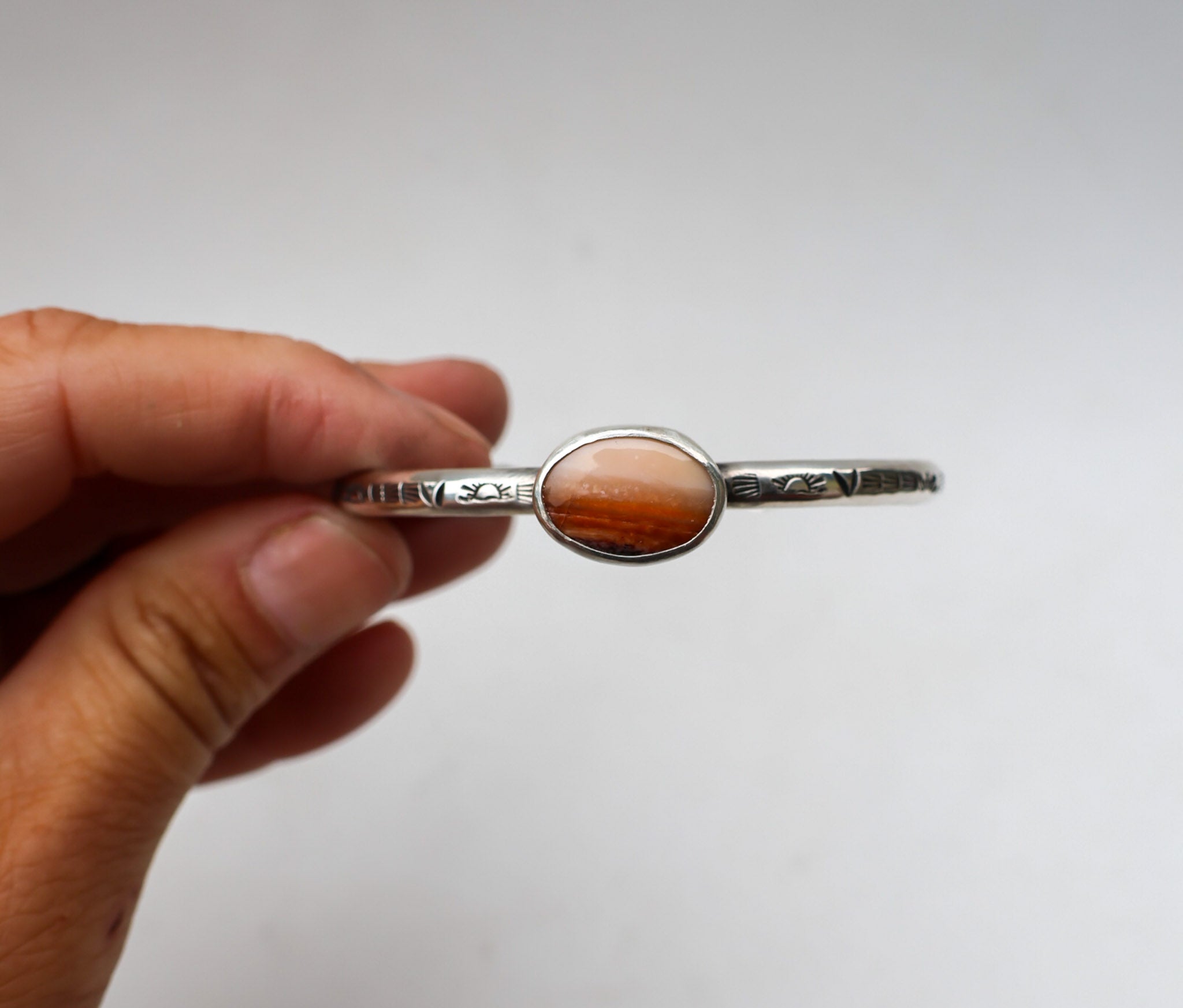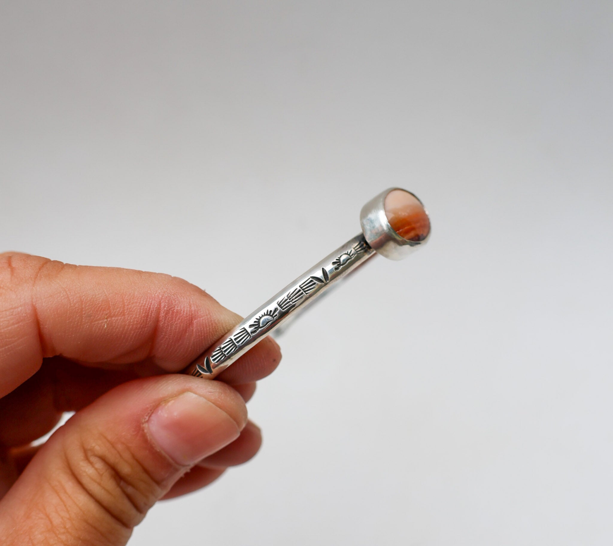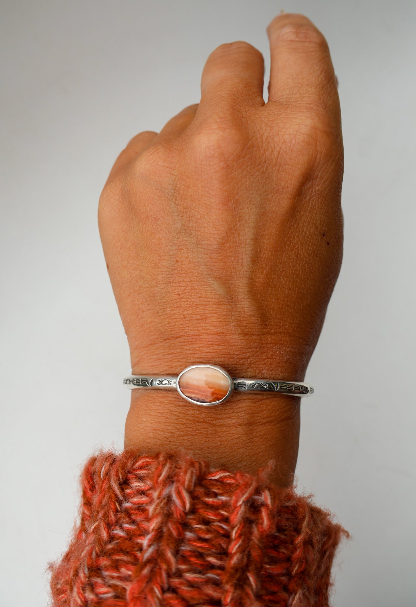 Made from 925 Sterling Silver and a 6 gauge thick sterling silver band. This cuff is a size medium, measuring 5.5” with a 1.5” gap. This will fit an ‘average’ typical women’s wrist size, and is slightly adjustable for a comfort fit.